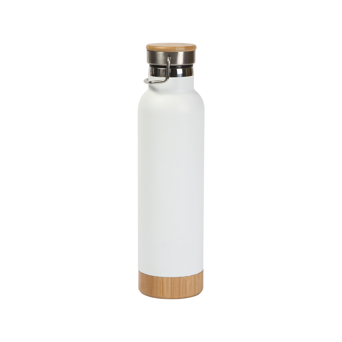 Botella de acero inoxidable doble pared con tapa de rosca fabricada en bambú, detalles en la base del mismo material. Capacidad de 600 ml.
