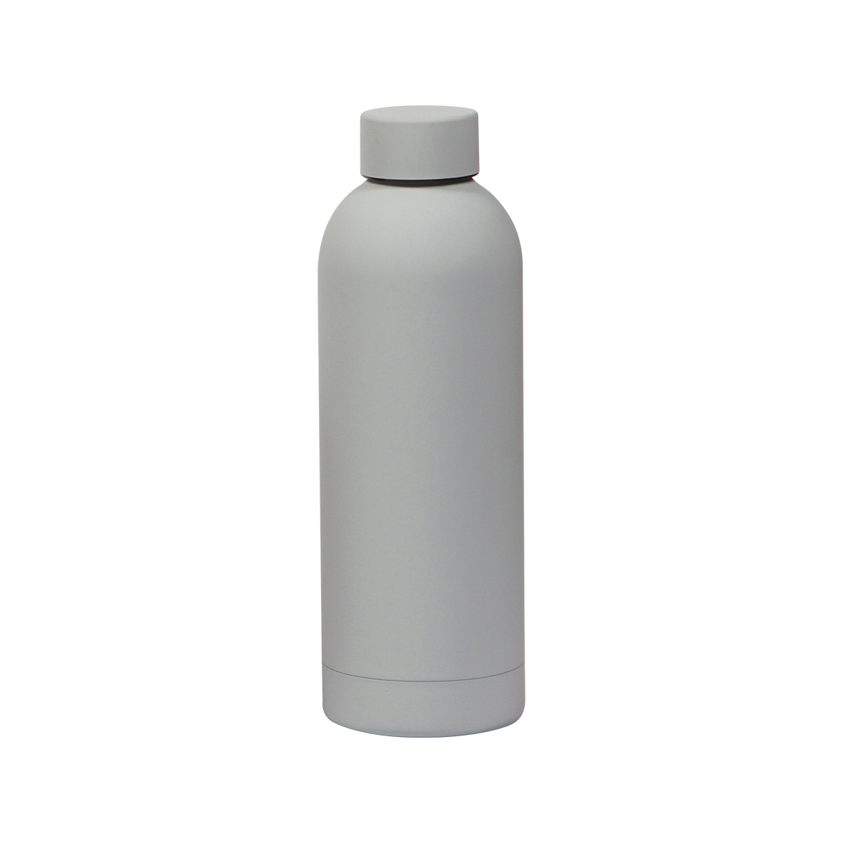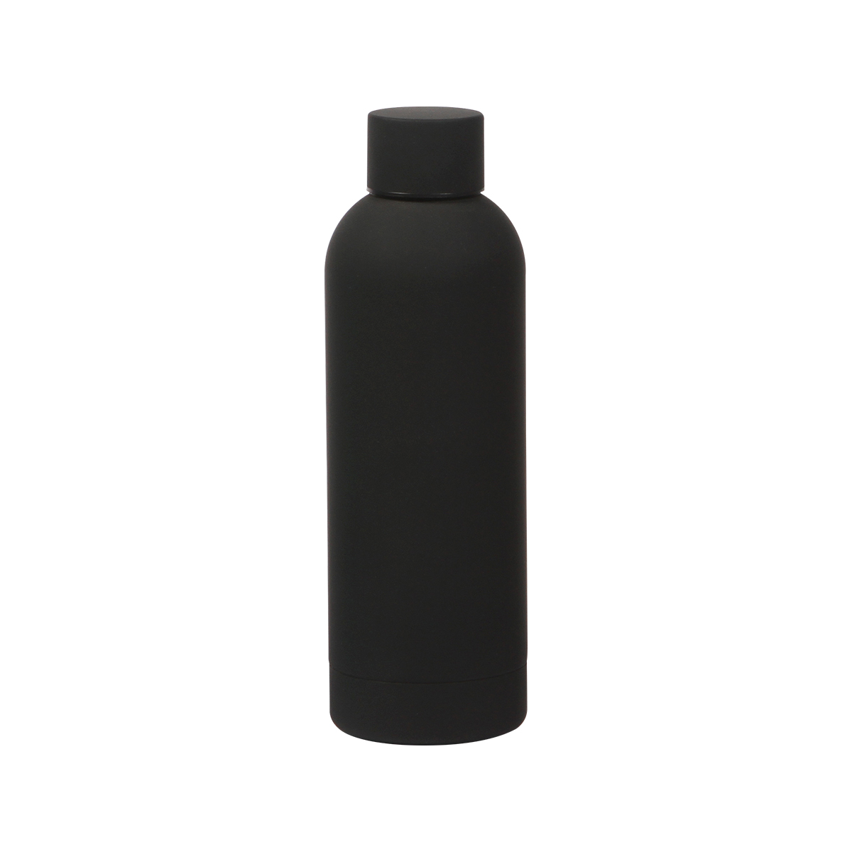 Botella de acero inoxidable doble pared con tapa de rosca y acabado tipo rubber. Capacidad de 500 ml.