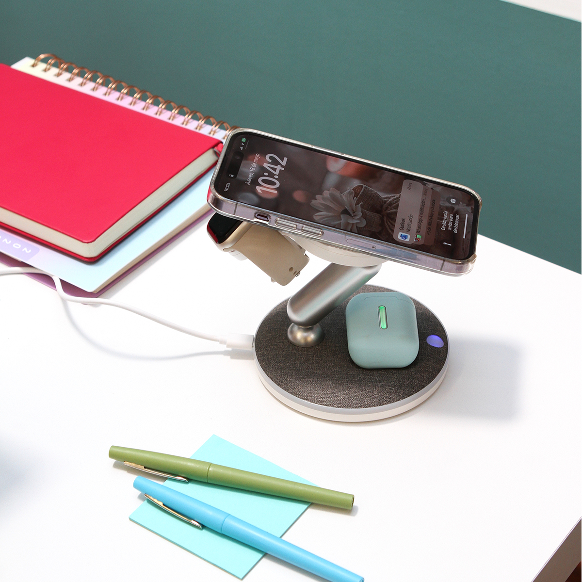 Cargador inalámbrico 3 en 1 , esta estación de carga rápida permite cargar tu teléfono, reloj y audífonos al mismo tiempo, funciona con dispositivos con tecnología Qi. Se puede plegar para ahorrar espacio siendo ideal para viajes, hogar u oficina. Incluye cable y caja de cartón individual.