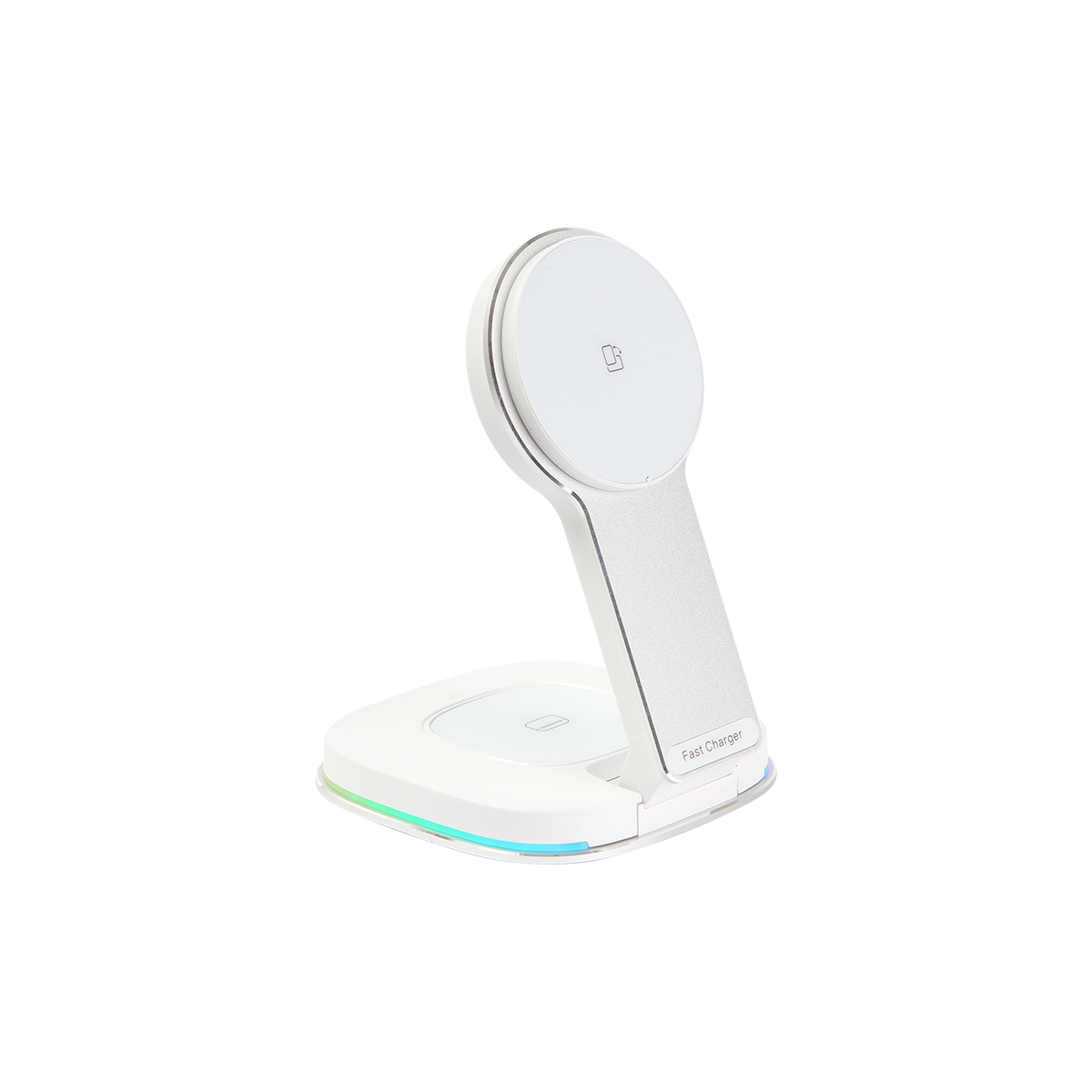 Cargador inalámbrico multifunción (reloj, audífonos y celular), fabricado en ABS, Policarbonato (PC), silicón y aleación de aluminio. Potencia de carga de hasta 15 W. Diseño plegable.