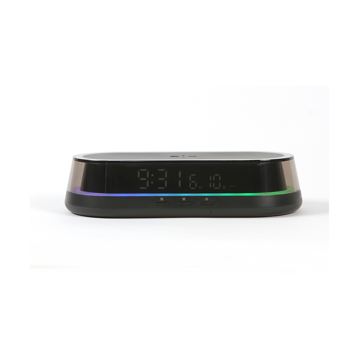 Cargador inalámbrico multifuncional para teléfono celular 15W. Con reloj y función de alarmas, incluye una lámpara de luz blanca en tres niveles y luz tipo RGB (colores). Diseño ergonómico especializado para escritorio y/o buró.