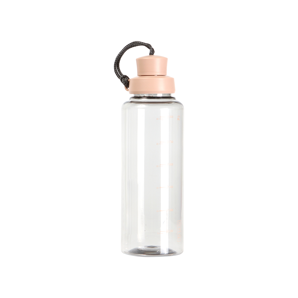 Cilindro transparente fabricada en policarbonato, con indicadores en mililitros y onzas, tapa de color y cordón sujetador tipo asa. Capacidad 1 litro.