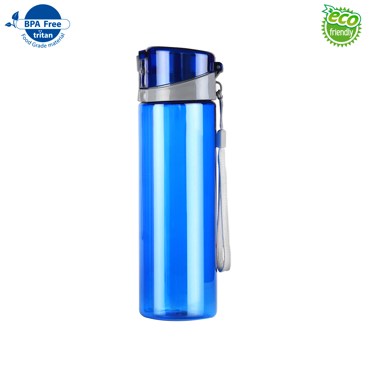Cilindro de Tritan con seguro en tapa de polipropileno y correa sujetadora, capacidad de 700 ml (23.5 oz).