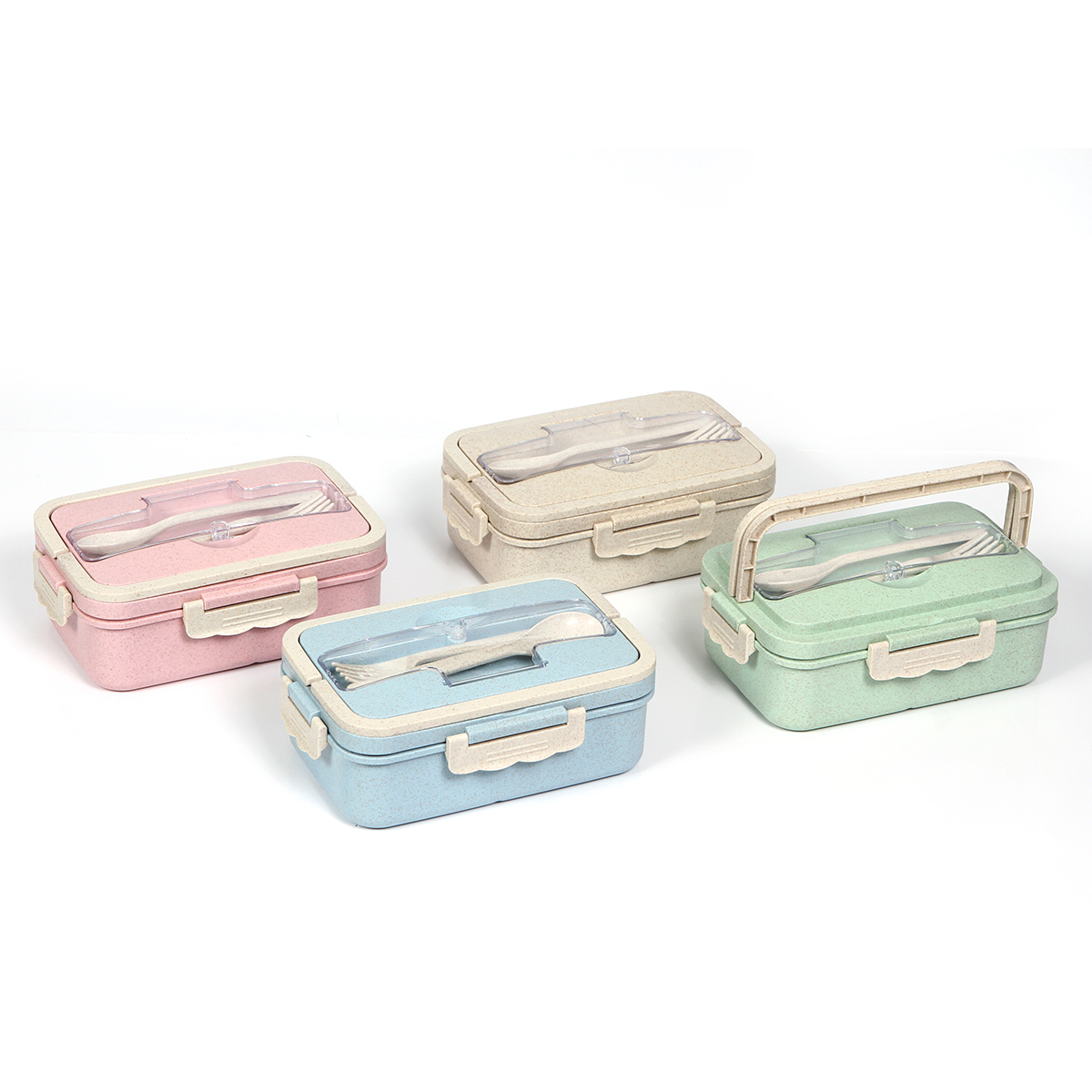 Contenedor para alimentos con asa, fabricado en 40% fibra de trigo y 60% polipropileno; con 3 compartimentos, tapa transparente y cubiertos, Capacidad de 1000 ml.