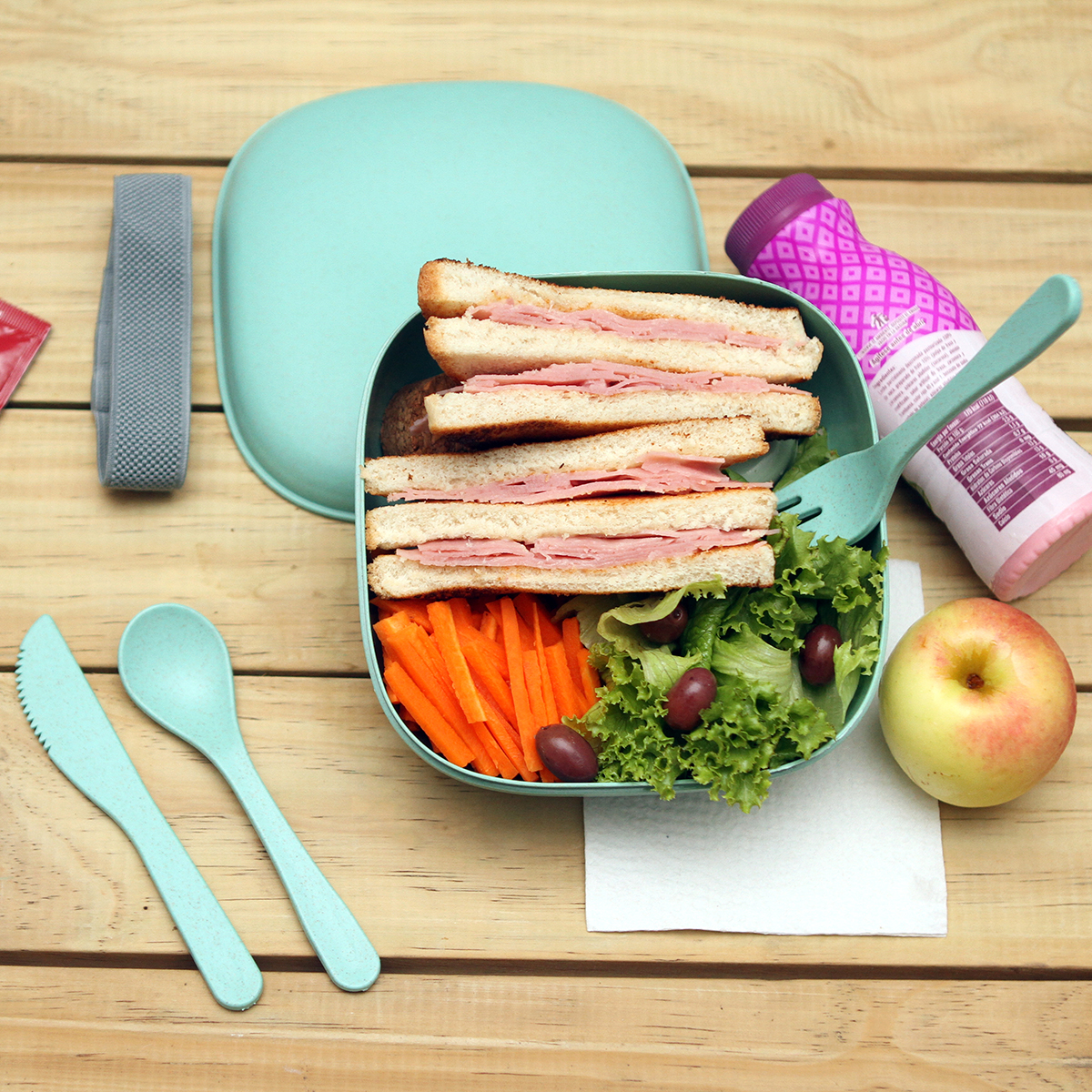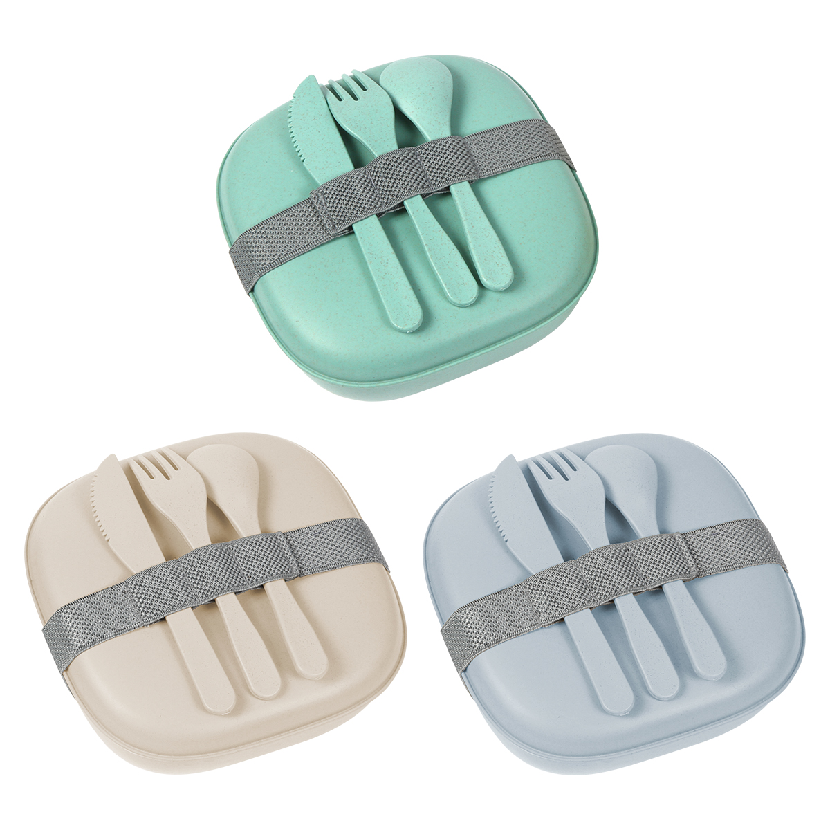 Contenedor para alimentos fabricado en fibra de bambú, con cubiertos del mismo material, y banda elástica. Incluye: cuchara, tenedor, cuchillo.