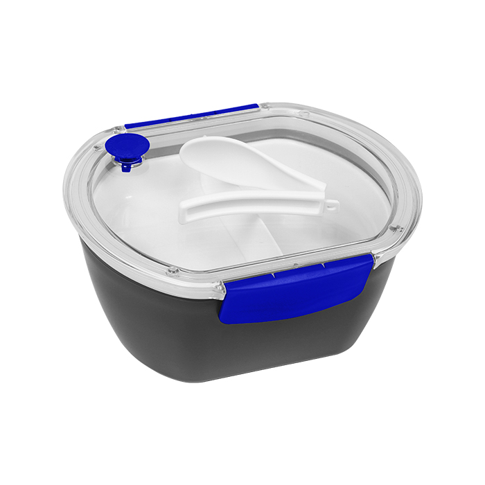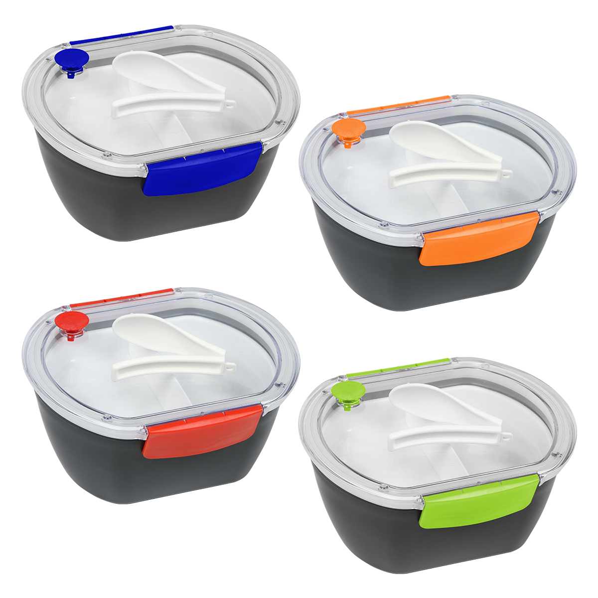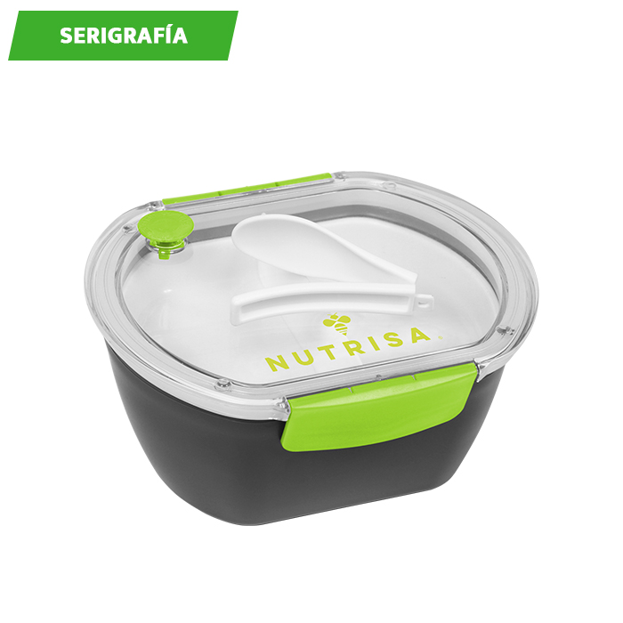 Contenedor para alimentos base en color negro fabricado en AS, tapa translucida de silicón con accesorios de colores y compartimentos con cuchara.