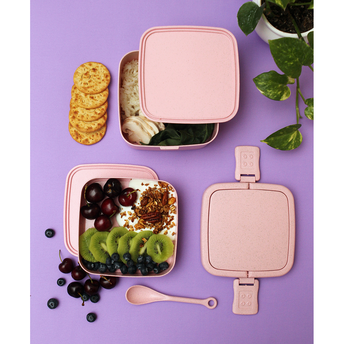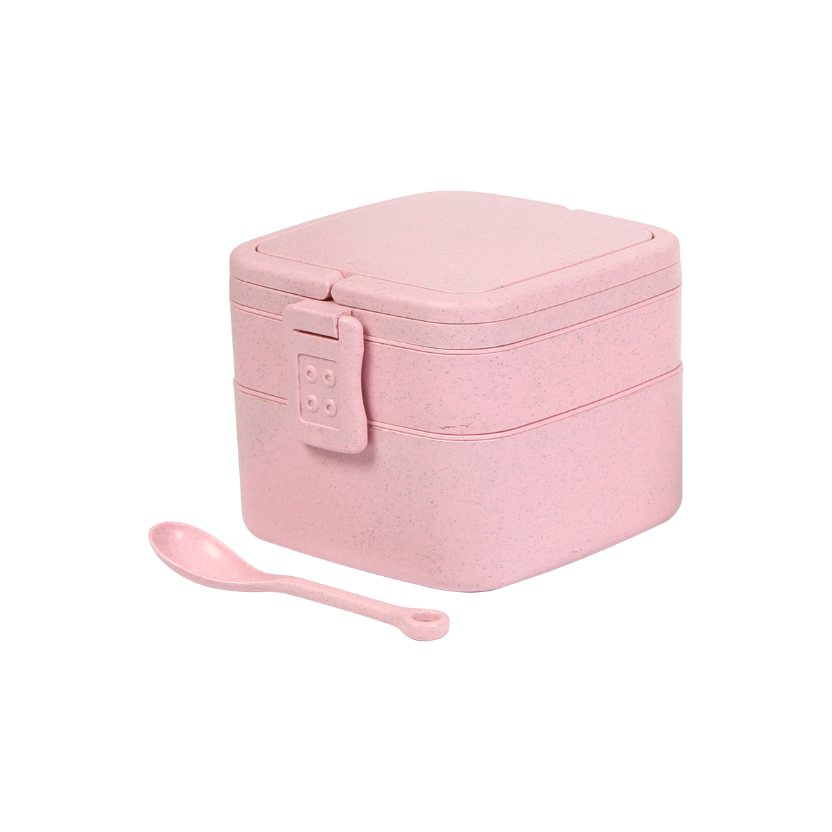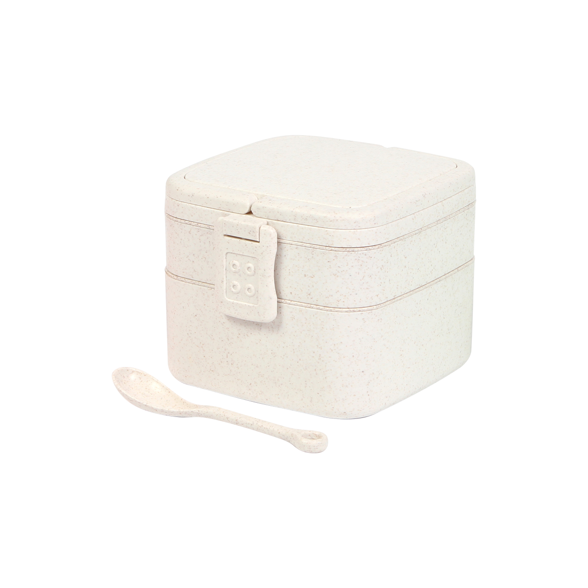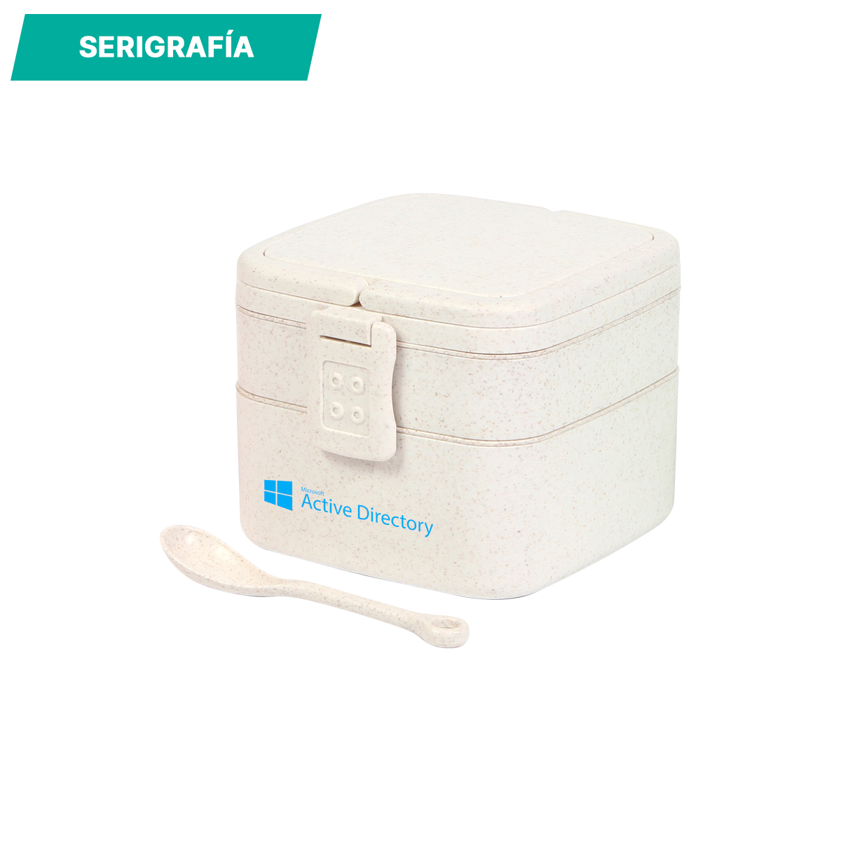 Contenedor de alimentos fabricado en fibra de trigo, con tres compartimentos y broches laterales de seguridad. Incluye cuchara del mismo material, capacidad de 1,000 ml. La mejor opción para llevar tus alimentos.