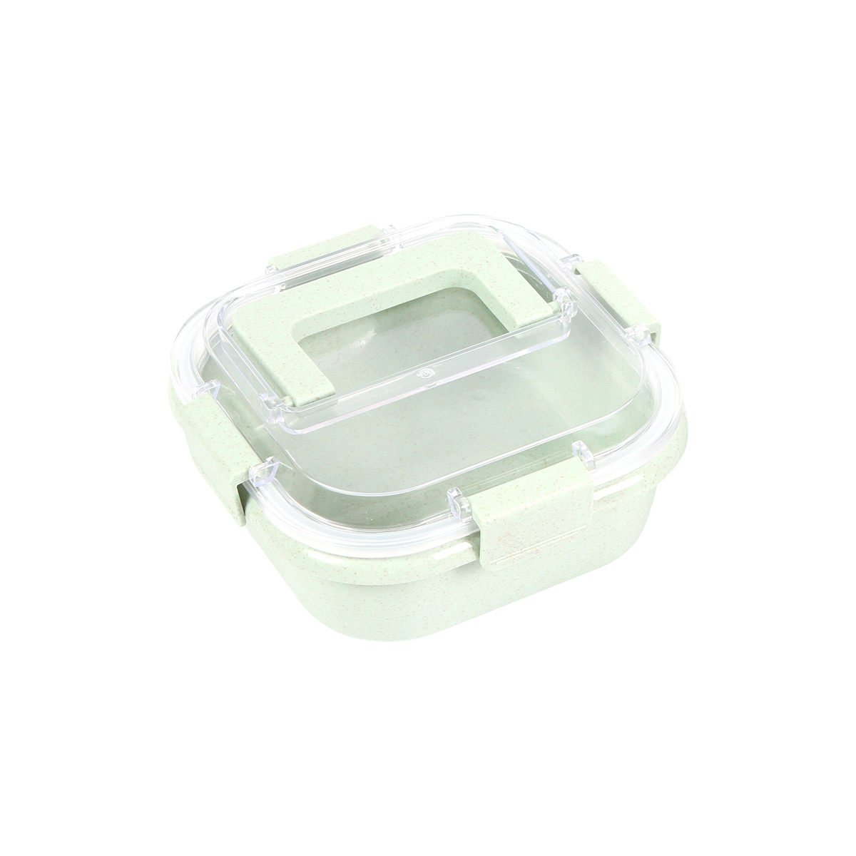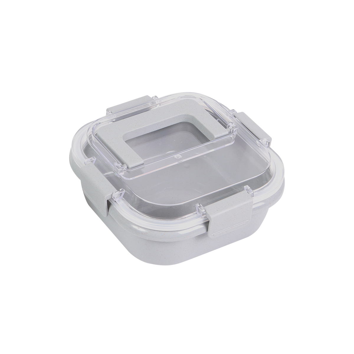 Contenedor de alimentos fabricado en polipropileno (PP) y fibra de trigo, con tapa fabricada en poliestireno (PS) y broches de seguridad.