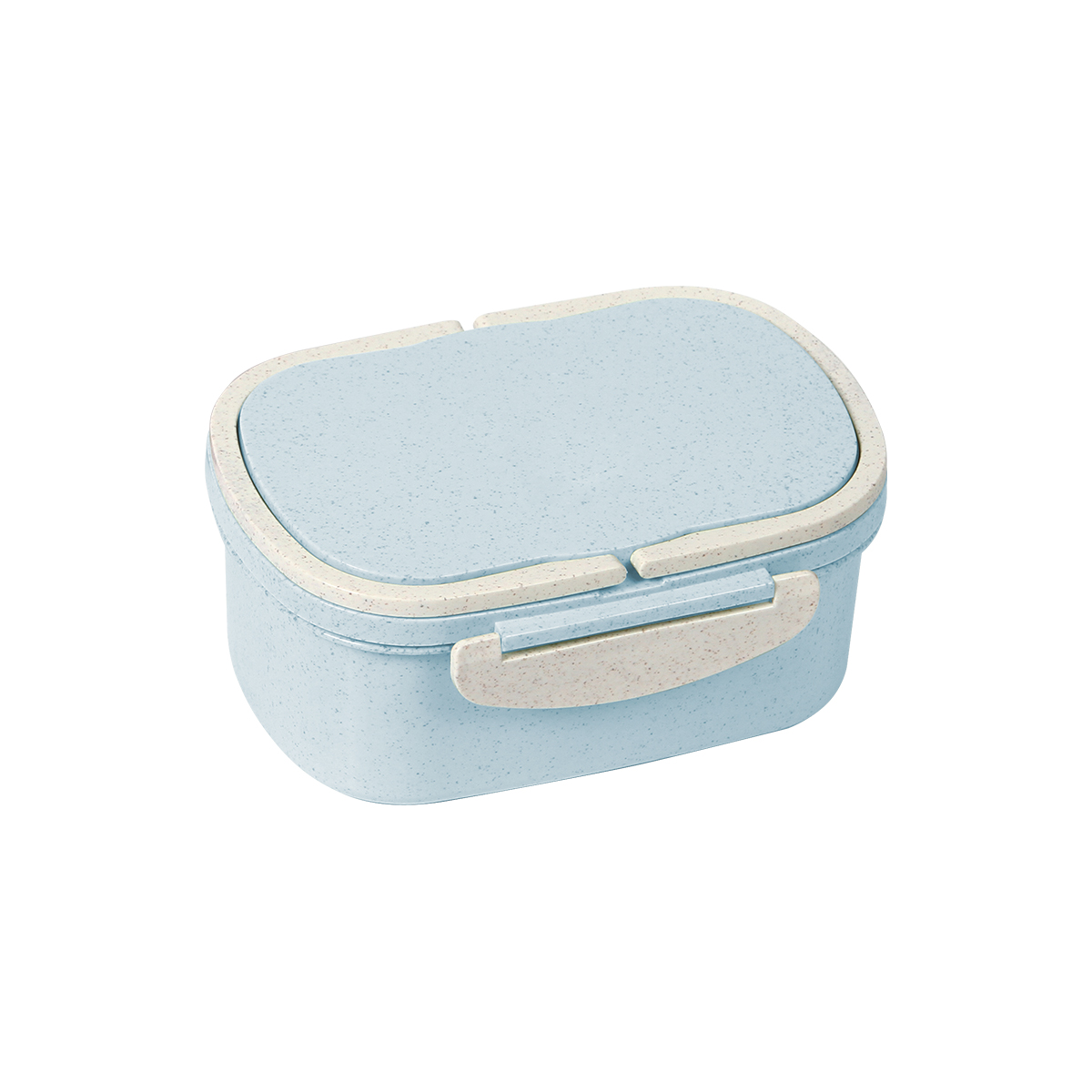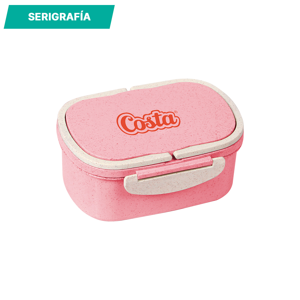 Contenedor de alimentos fabricado en fibra de trigo y PP, con dos compartimentos y cuchara fabricada en el mismo material, no usar en microondas. Capacidad 900 ml.