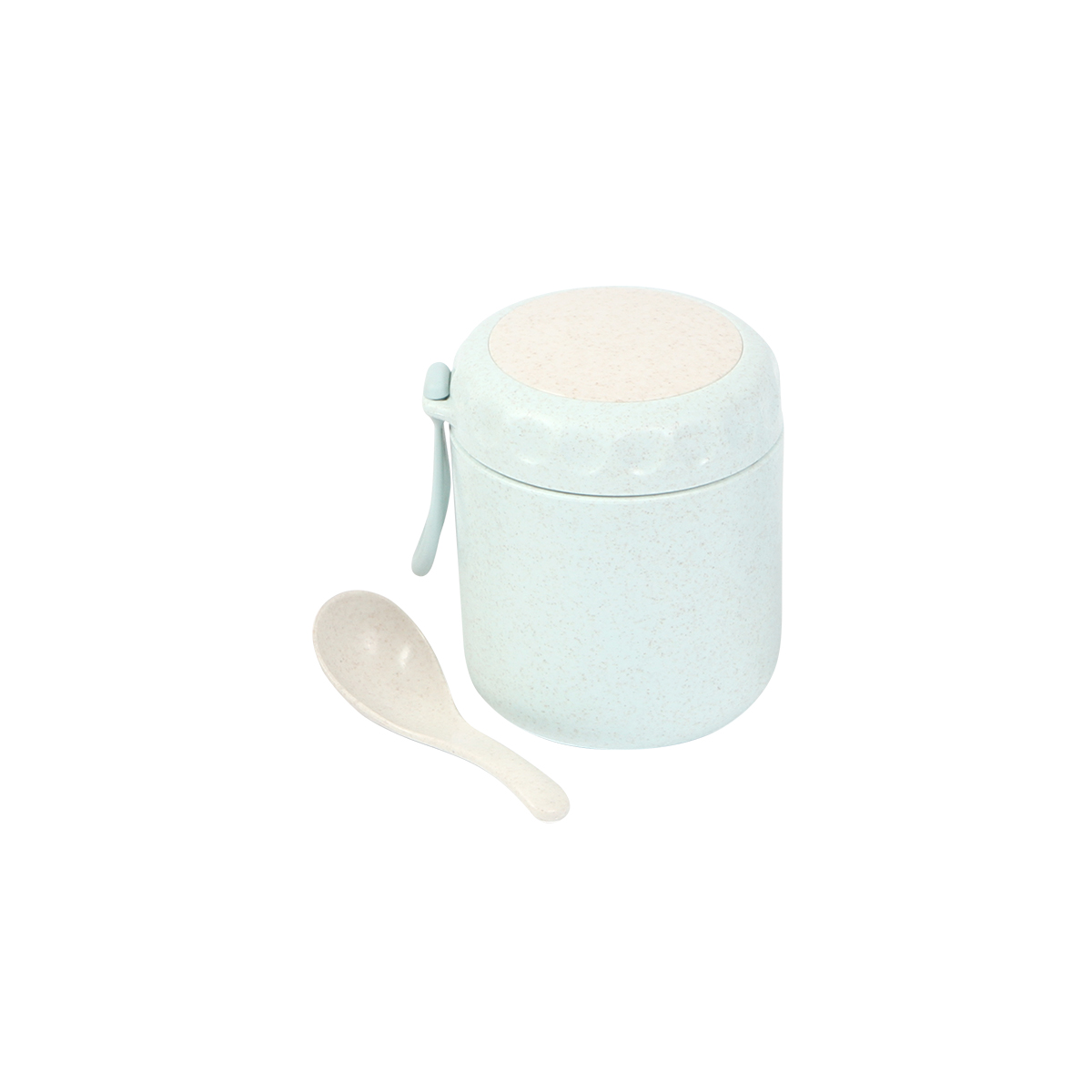 Contenedor de alimentos fabricado en polipropileno (PP) y fibra de trigo. Incluye cuchara y correa. Capacidad 380 ml.