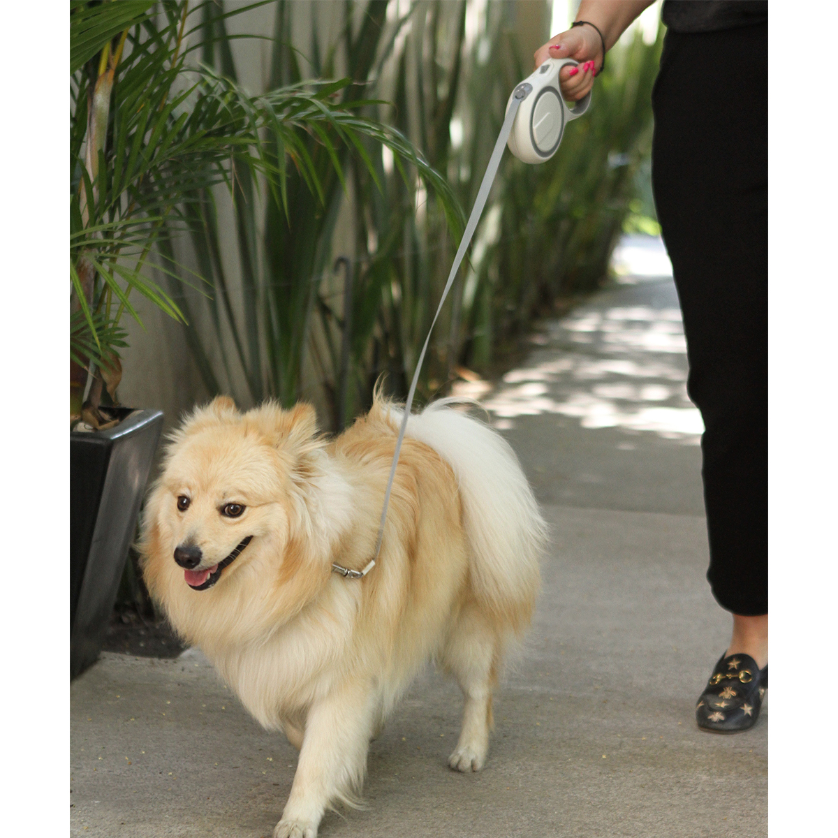 Correa retráctil de 5 metros, fabricada en plástico ASB + TPE (elastómero termoplástico), con seguro para fijar la cinta. Incluye caja de cartón individual.