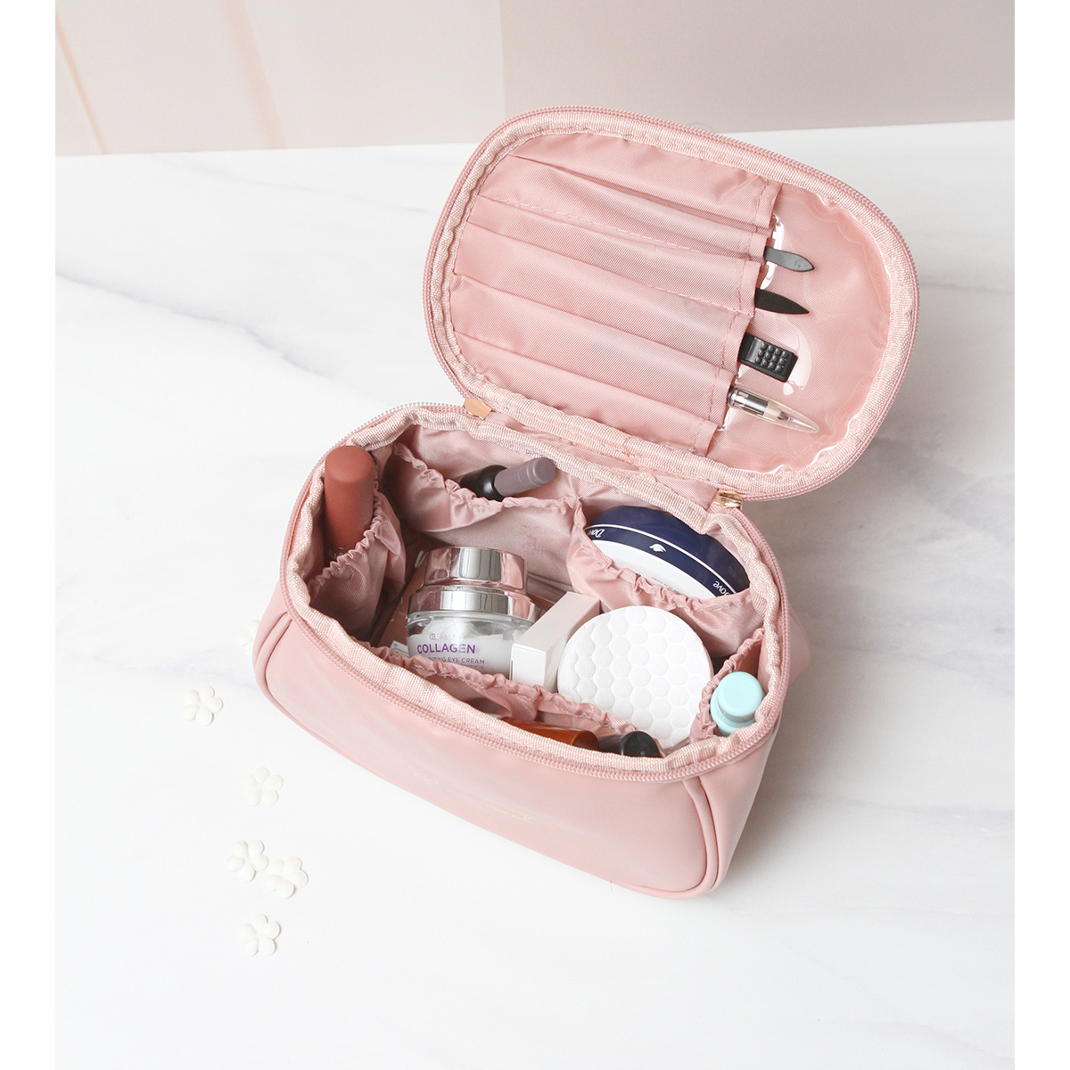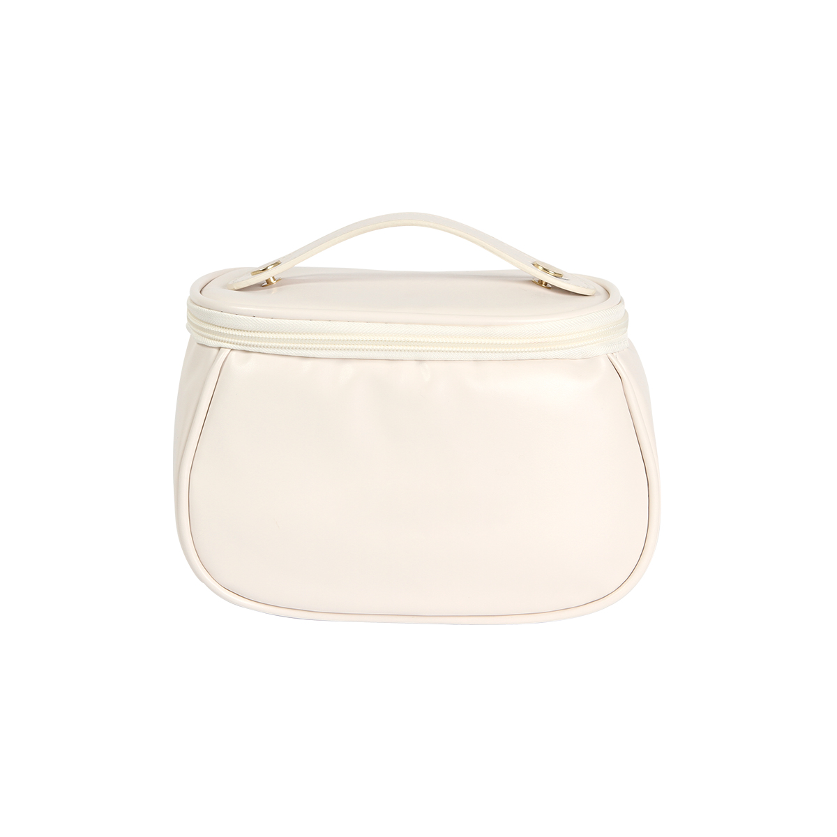Bolsa cosmetiquera fabricada en cuero sintético (PU) y PVC, con forro elaborado en Nailon. Con detalle metálico en cierre, 6 compartimentos en el interior para cosméticos y bolsillos internos para brochas.