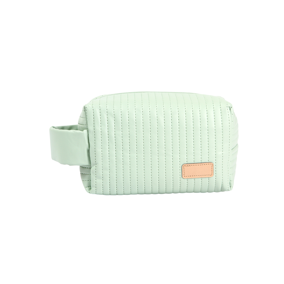 Bolsa cosmetiquera fabricada en PU. Con compartimentos interiores y asa a un costado.