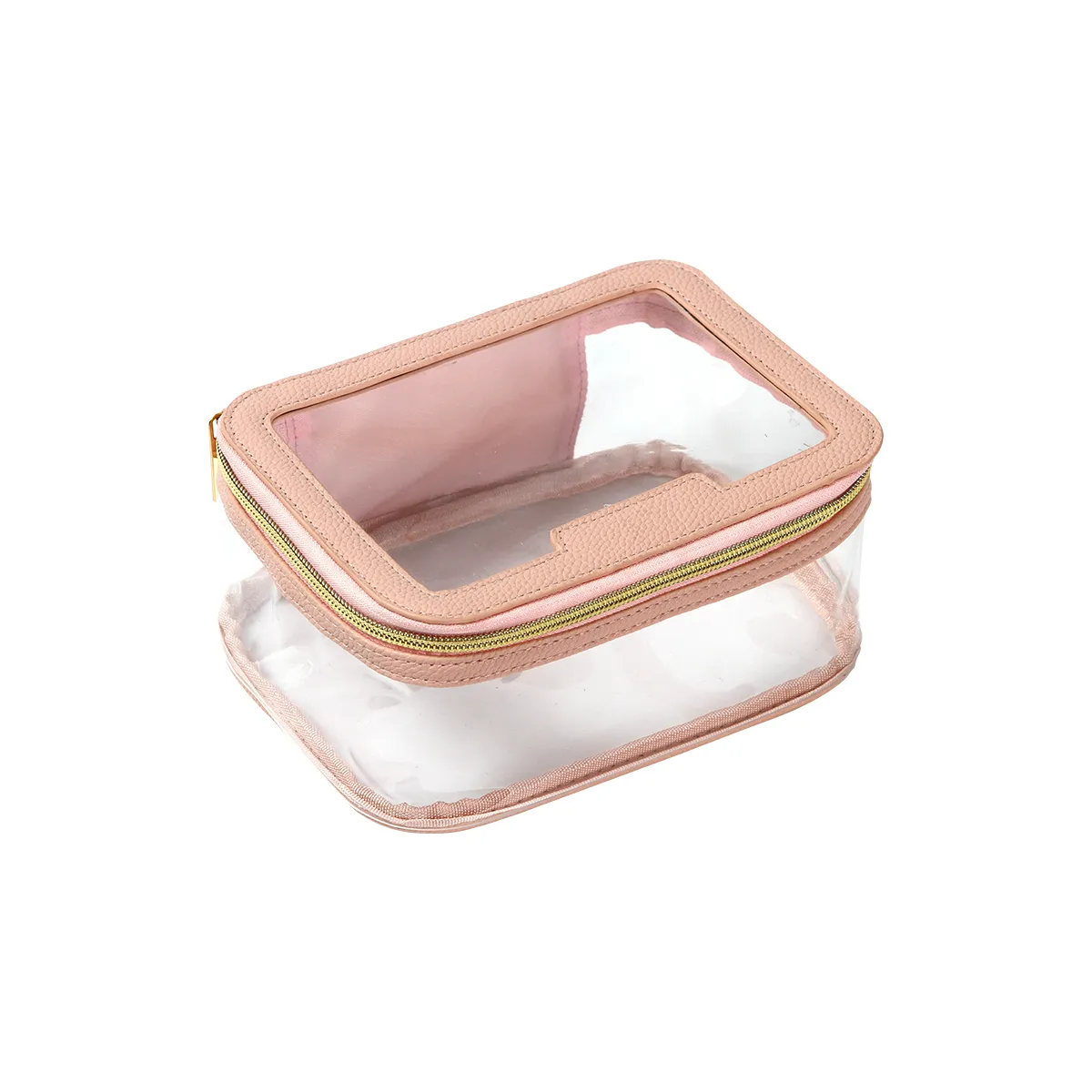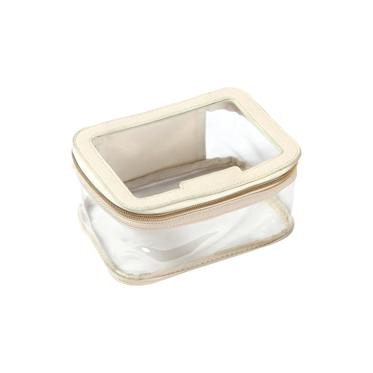 Cosmetiquera fabricada en plástico PVC traslúcida con detalles en PU. Con un compartimento principal con cierre metálico. Diseñada para organizar productos cosméticos y otros de cuidado personal, como cremas, maquillaje, cepillos, etc. Su ventana transparente ayuda a tener una mejor visibilidad de dichos artículos."
