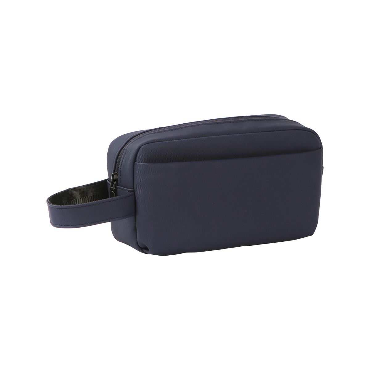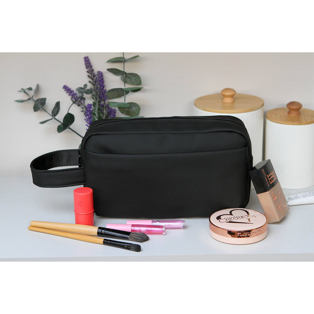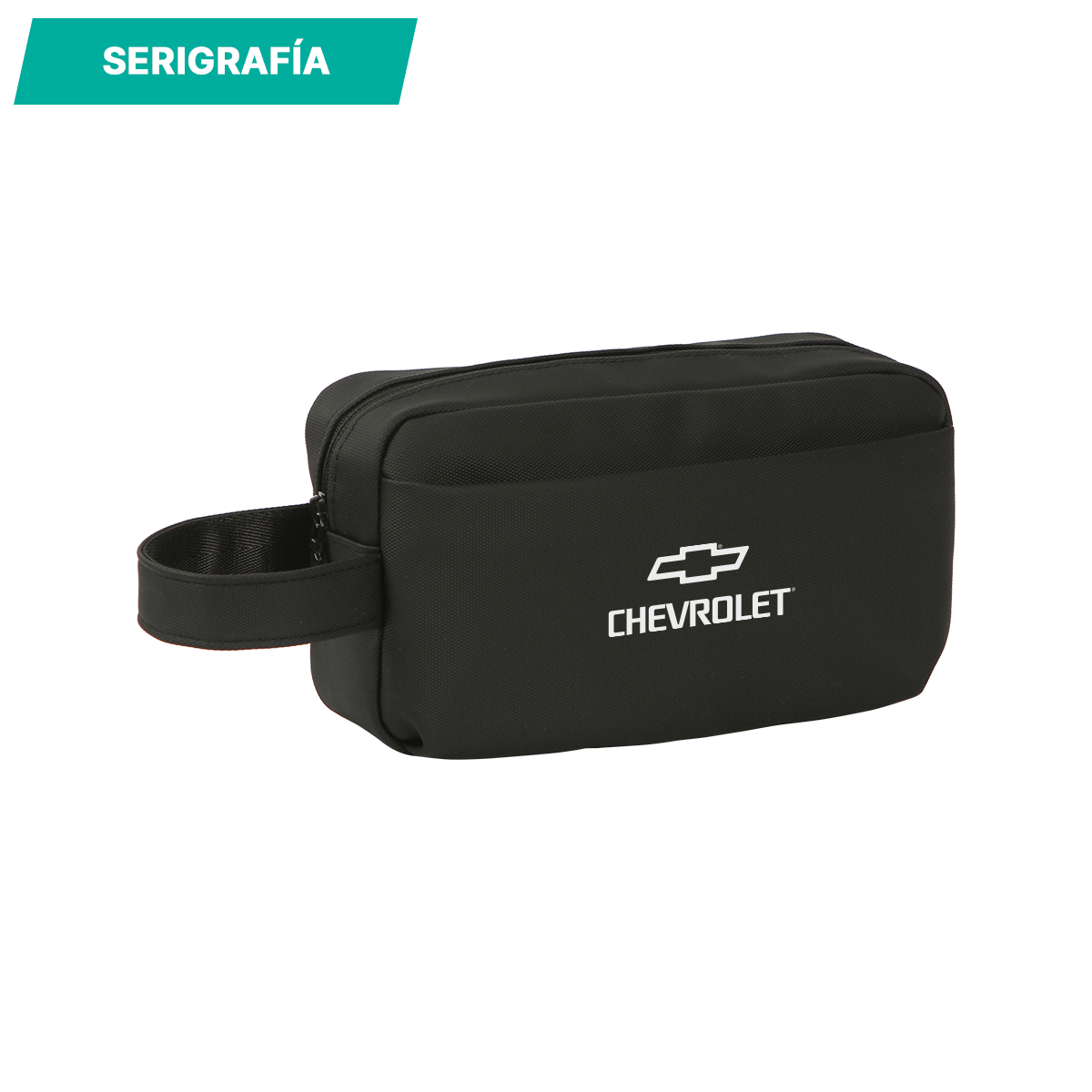 Cosmetiquera fabricada en tela tipo oxford con acabado a prueba de agua. Dentro incluye un forro tipo diamante. Con un compartimento principal con cierre y una agarradera lateral para su fácil manejo.