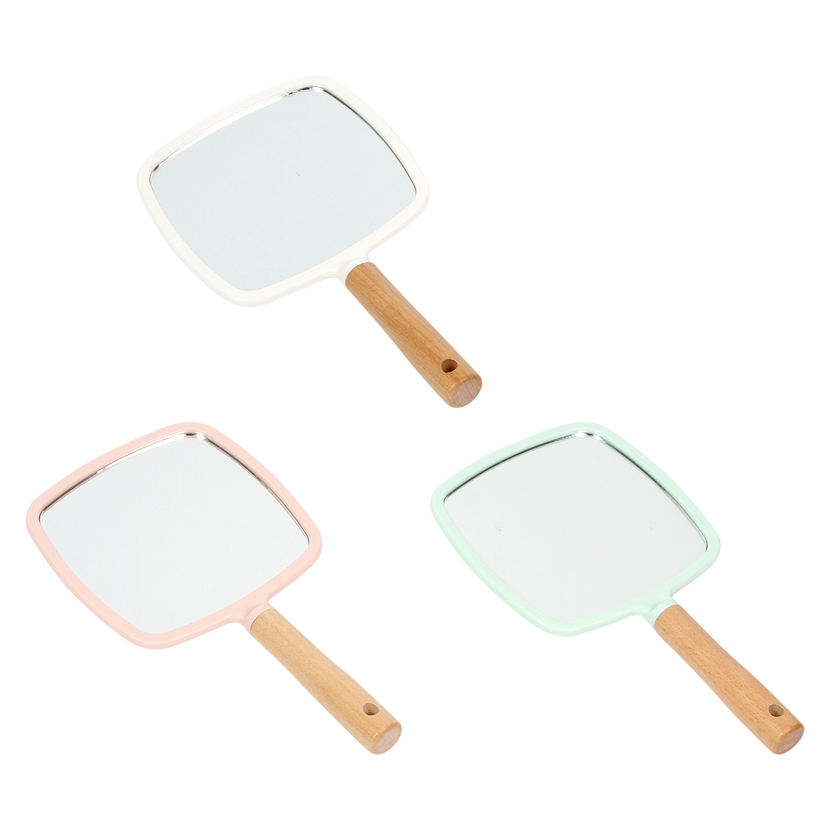 Espejo con forma cuadrada con puntas redondeadas fabricado en plástico tipo PS caracterizado por colores con acabados brillantes y es liviano. Cuenta con mango en madera con acabado en laca para una mayor protección y abrasión.