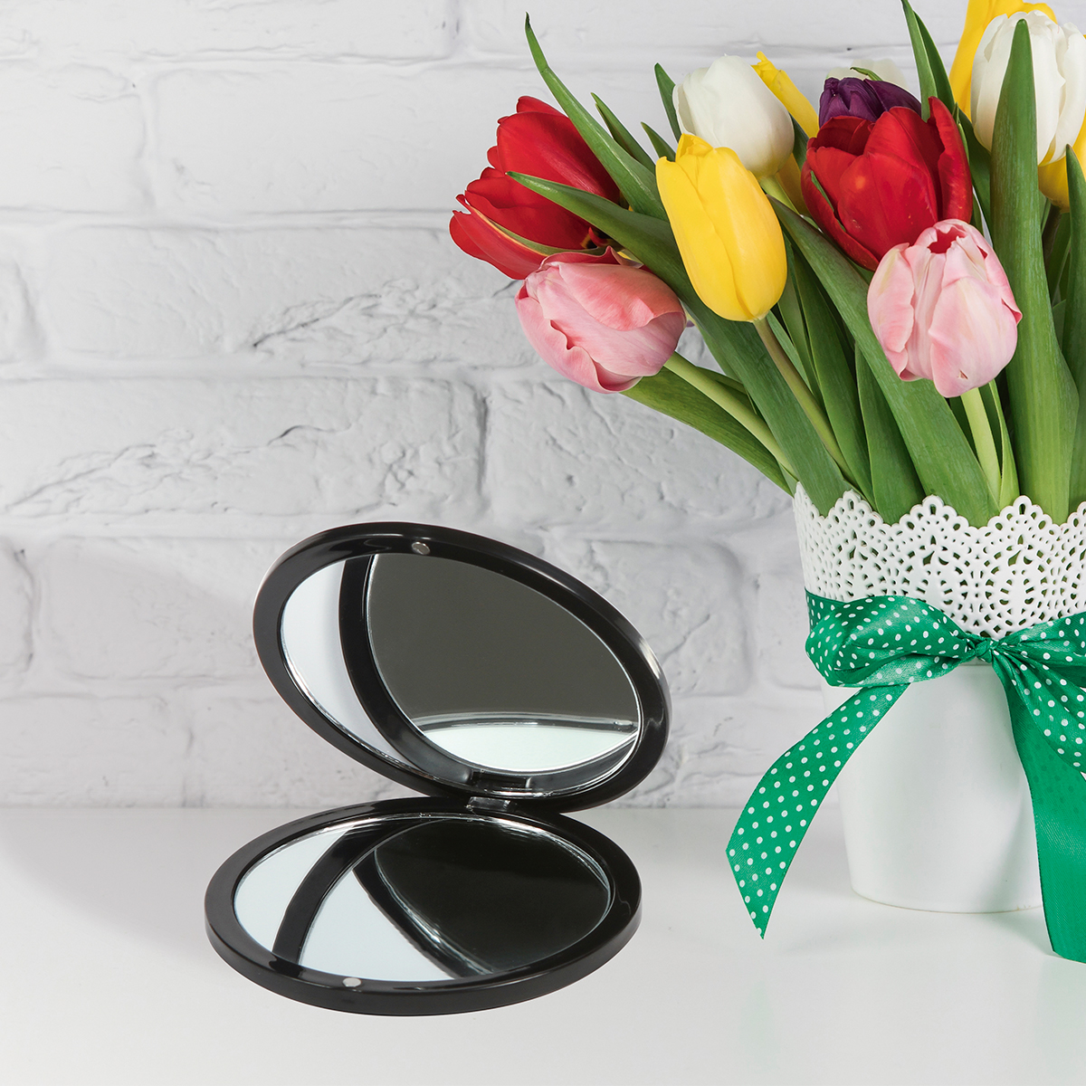 Espejo redondo doble, fabricado en plástico, 7.6 cm. de diámetro. Cuenta con doble vista.