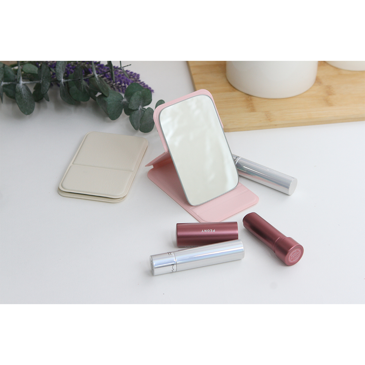 Espejo de bolsillo fabricado en curpiel en forma rectangular. Cuenta con relieves en la tapa que permiten montar el espejo a la altura deseada y facilitar su uso. Gracias a su tamaño y a que es bastante ligero, es ideal para llevarlo contigo todos los días.