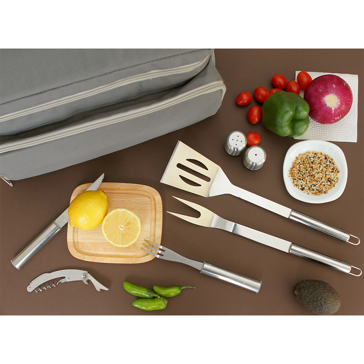 Hielera con set BBQ de 10 piezas, es un conjunto de herramientas esenciales para la parrilla, fabricadas en acero inoxidable de alta calidad. Incluye una tabla para picar de madera, 1 pimentero, 1 salero ambos con tapa, una espátula tipo grill, un tenedor grill, una pinza grill, un cuchillo para cortes, tenedor para carne y un abre botellas, junto con una hielera fabricada en poliester resistente para transportar y almacenar las herramientas de manera segura.