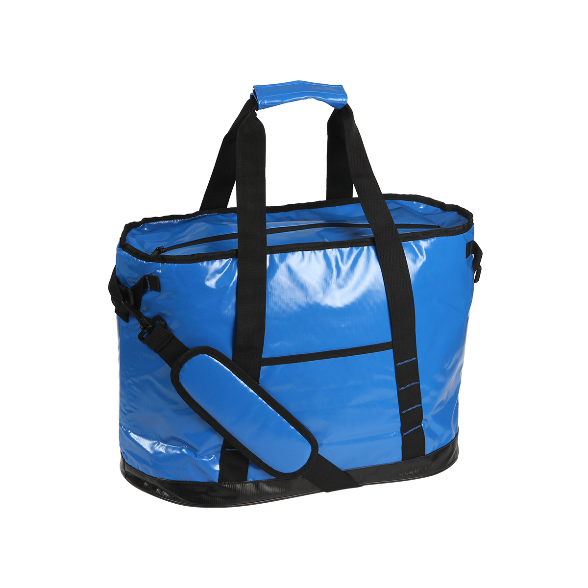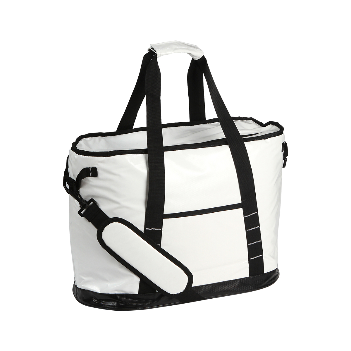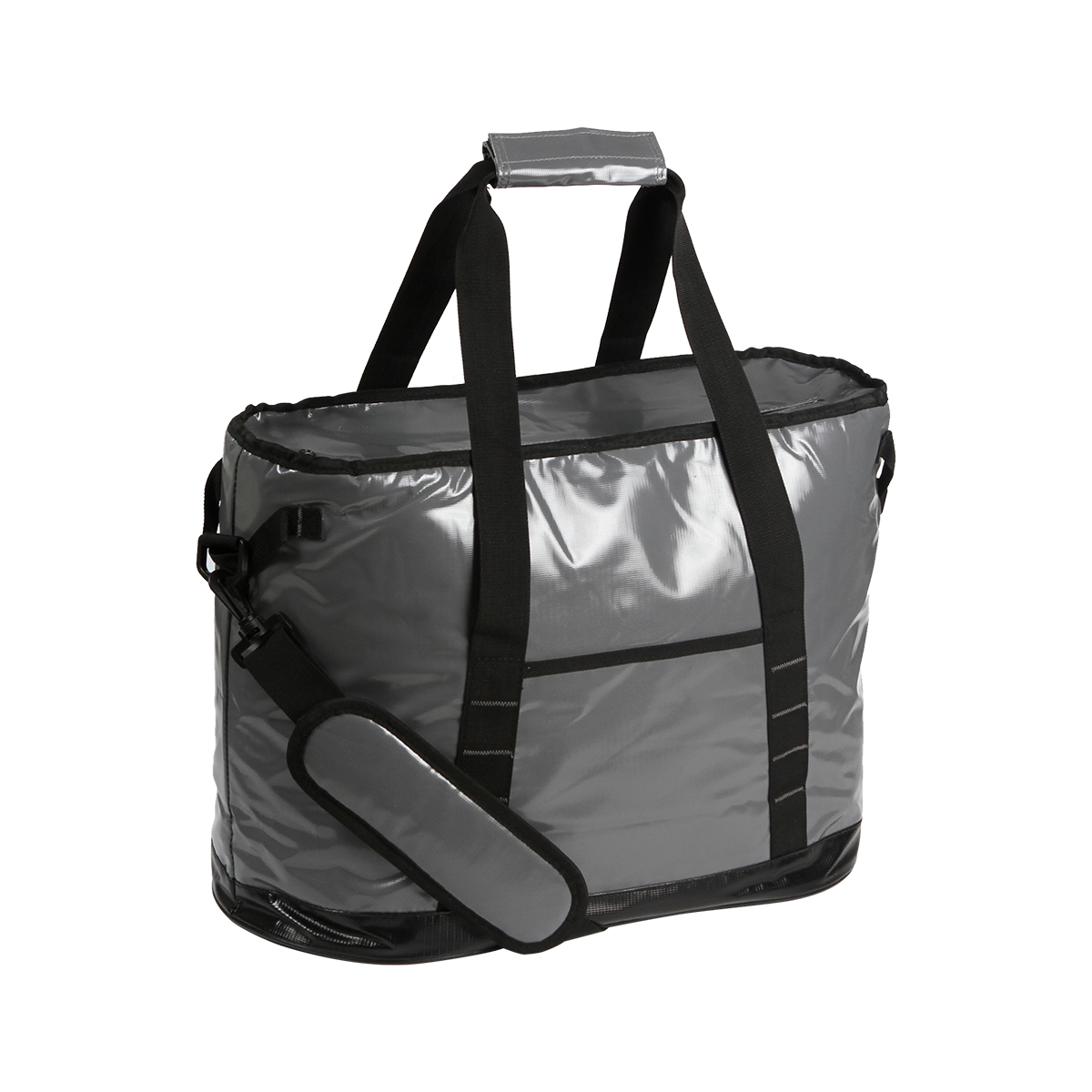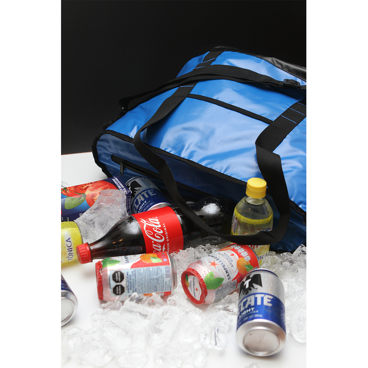 Hielera fabricada en lona alquitranada, polietil vinil acetato (PEVA) y espuma de polietileno (PE) de 6 mm. Con asas superiores y correa para hombro, capacidad para 24 latas (32-35 litros aproximadamente) y resistente al agua.