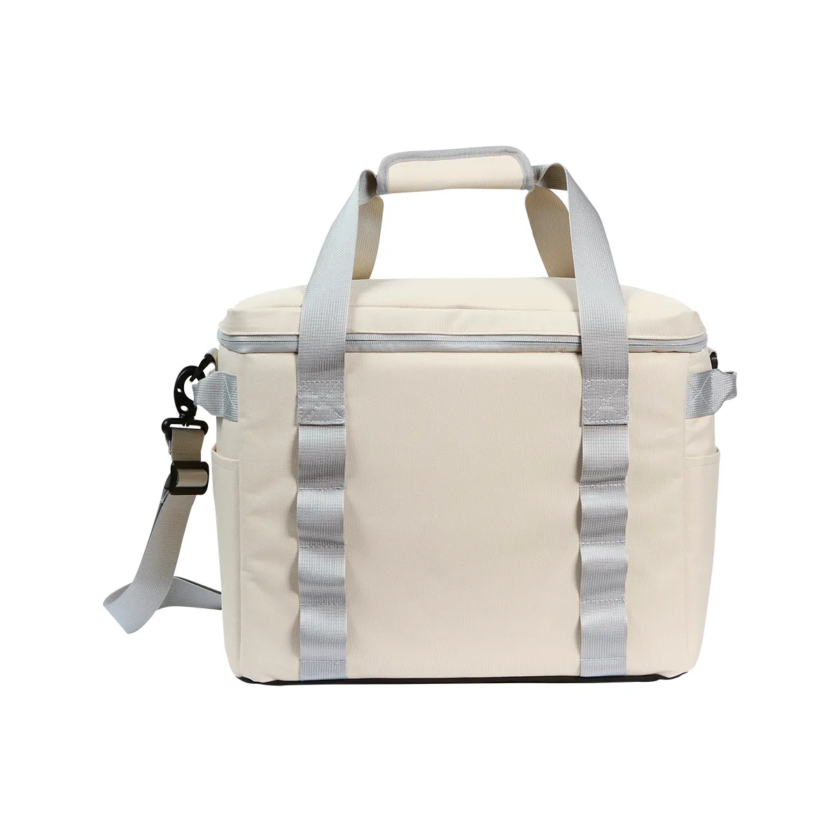 Hielera portatil fabricada en tejido tipo Oxford 600D con forro en polietileno, con gran capacidad de almacenamiento, ideal para conservar bebidas y alimentos fríos hasta por 8 horas. Cuenta con una placa separada en la parte inferior para facilitar la limpieza de la hielera, un compartimento principal con cierre, un bolsillo lateral de cada lado, bolsillo con cremallera en la parte trasera y correa al hombro desmontable. Perfecta para viajes, picnic o playa.