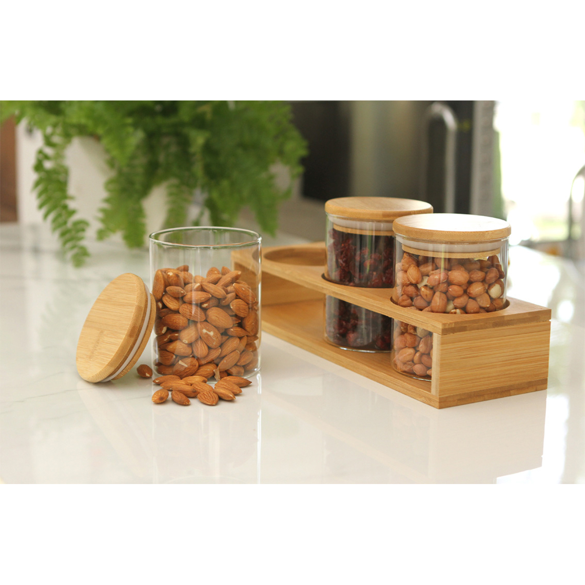 Set de 3 contenedores de 500 ml fabricados en vidrio de borosilicato con tapa y soporte de bambú. Incluye caja de cartón individual. Mantén tus alimentos siempre frescos con el sistema de cerrado hermético.