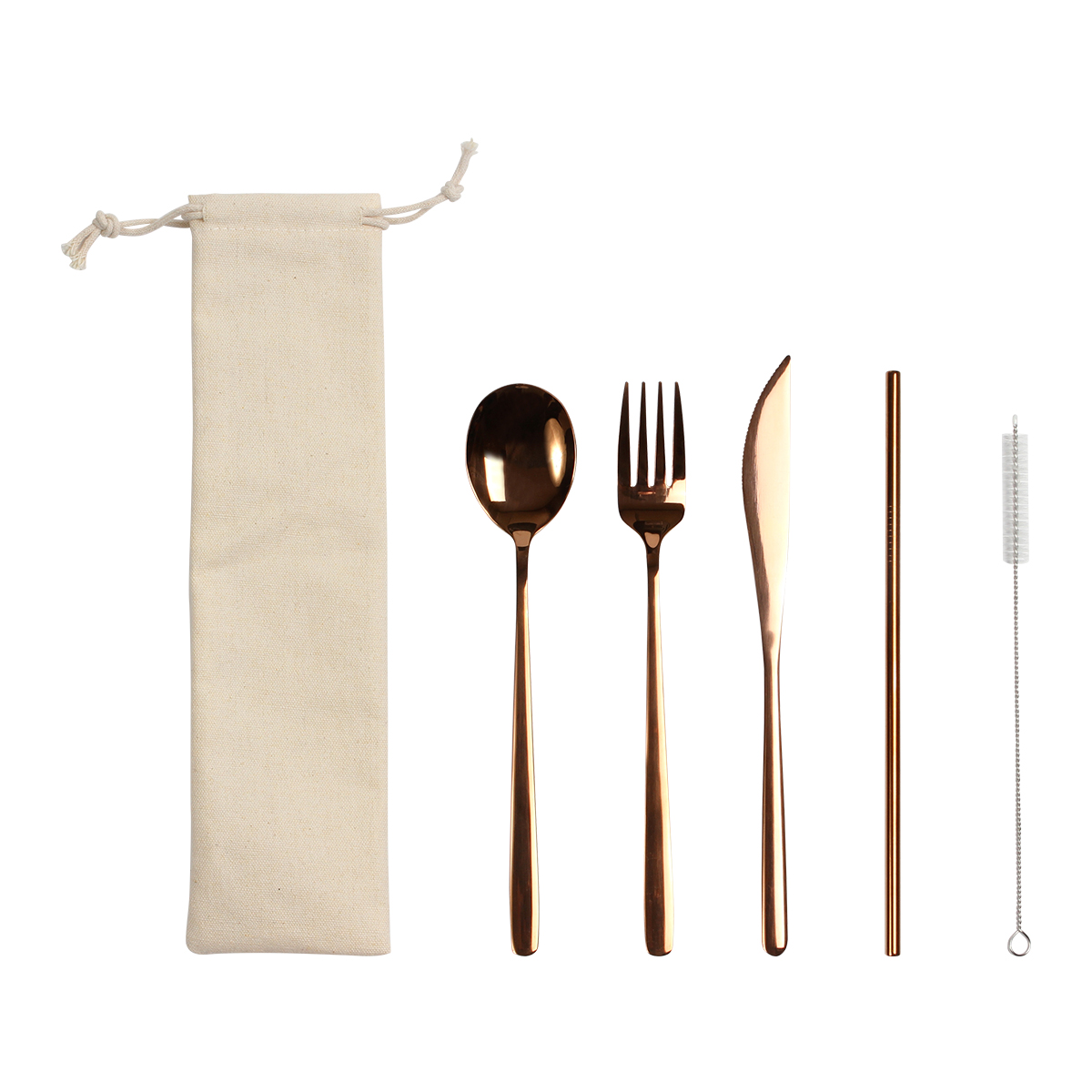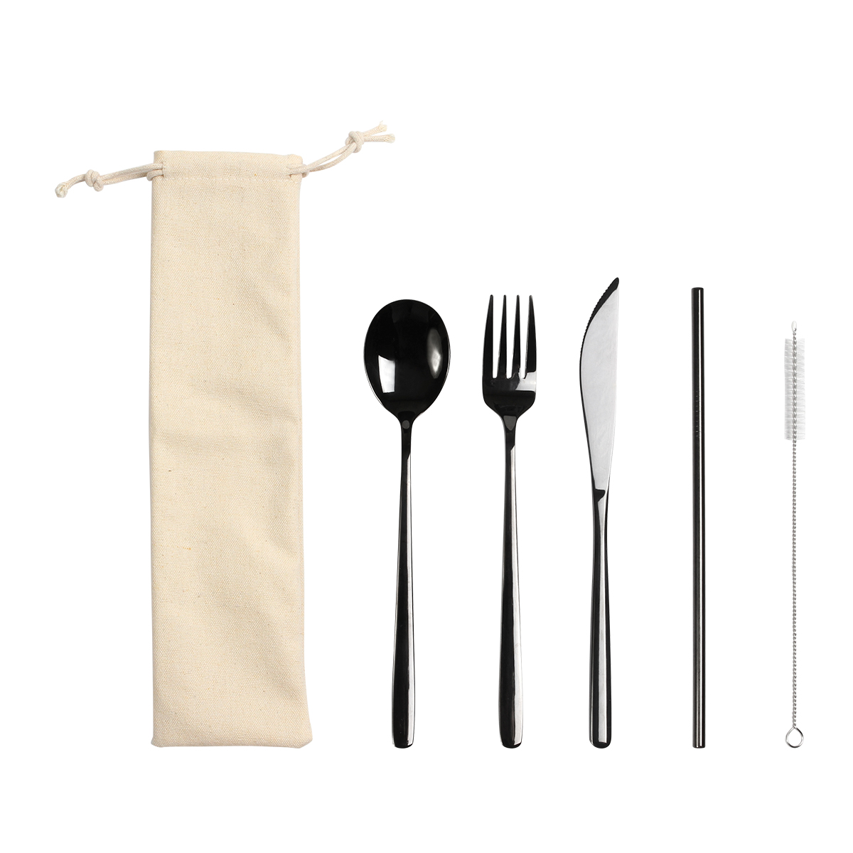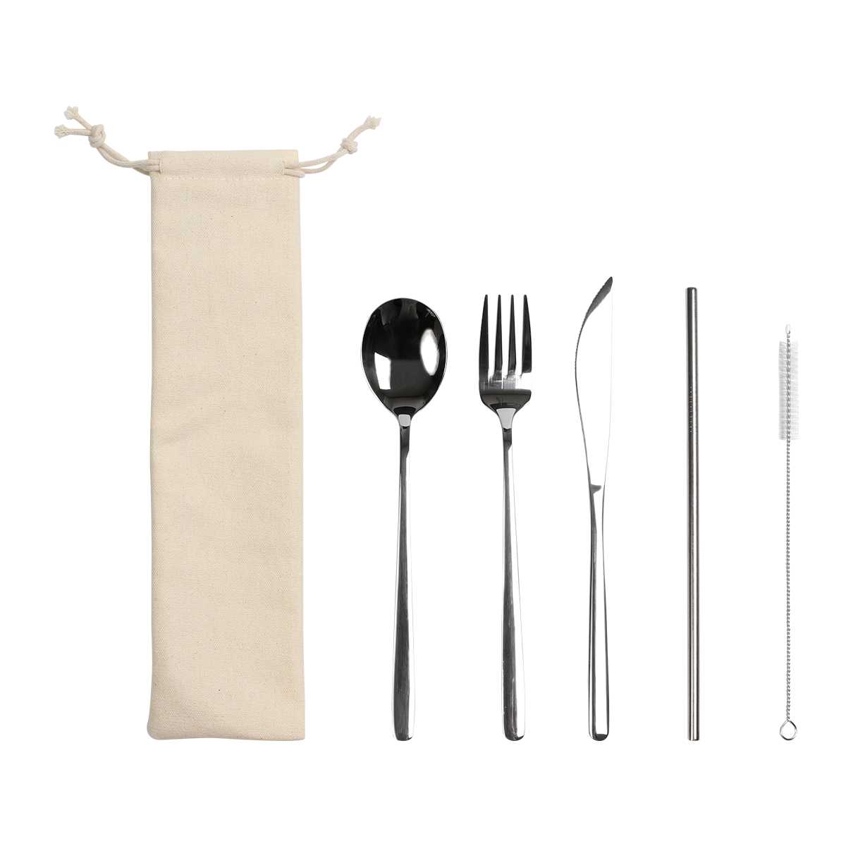 Juego de cubiertos fabricados en acero inoxidable; incluye cuchillo, tenedor, cuchara, popote y cepillo limpiador. Incluye bolsa de algodón de fácil cierre y apertura. Los cubiertos se pueden grabar y la bolsa cuenta con amplia área para impresión. Son ideales para viajar y responsables con el medio ambiente.
