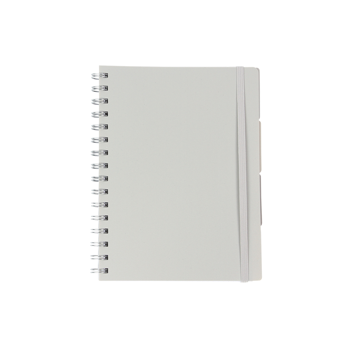 Libreta ecológica fabricada con cubierta y separadores de polipropileno reciclado con wire-o, tamaño A5, resorte sujetador de pastas y peso de 80 gramos. Papel 100 % reciclado con 96 hojas cuadriculadas y de rayas que vienen intercaladas.