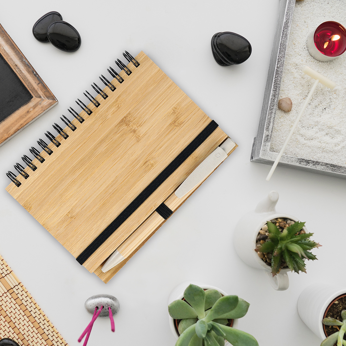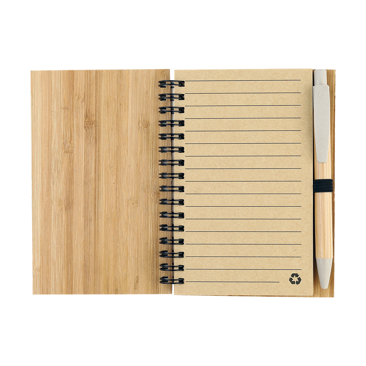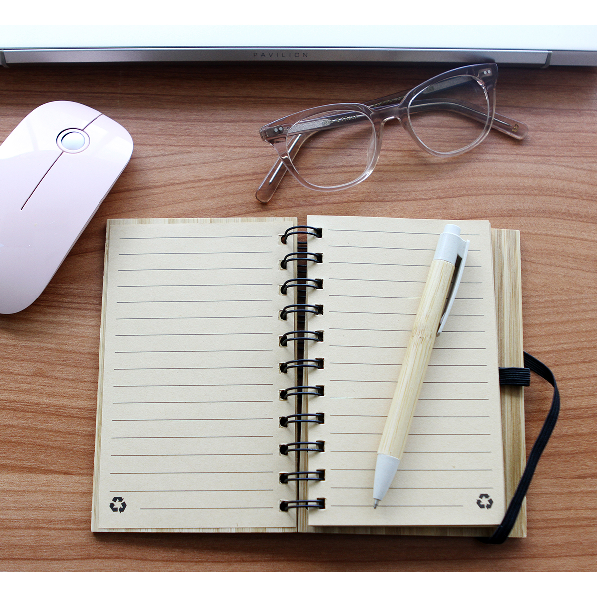 Libreta con pasta rígida de bambú, 70 hojas de papel kraft, con banda elástica y bolígrafo con barril de bambú y detalles en fibra de bambú. Tinta de escritura negra. Tamaño A6.