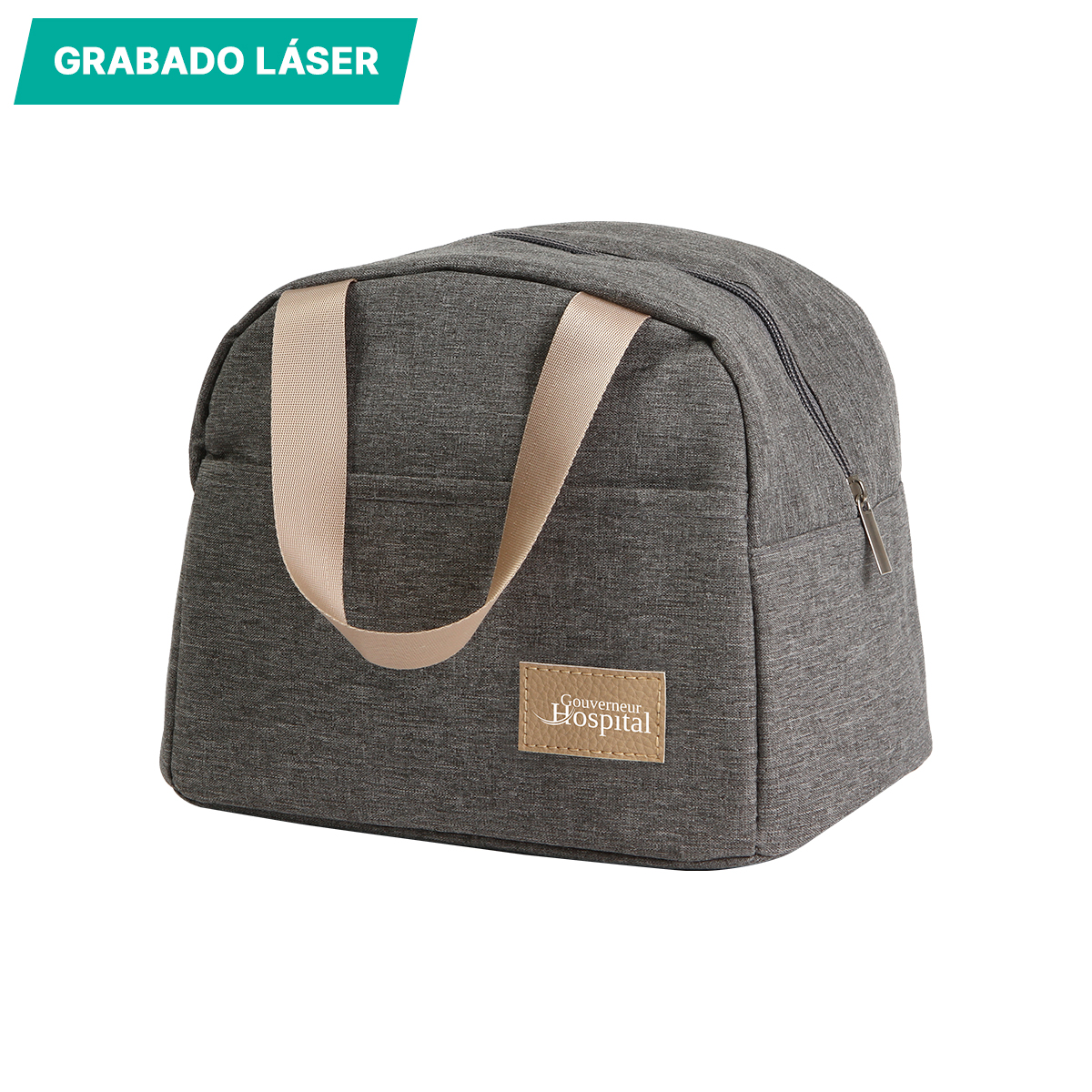 Hielera fabricada en poliéster catiónico con forro de aluminio, Correas de nylon, bolsillo frontal y detalle en curpiel.