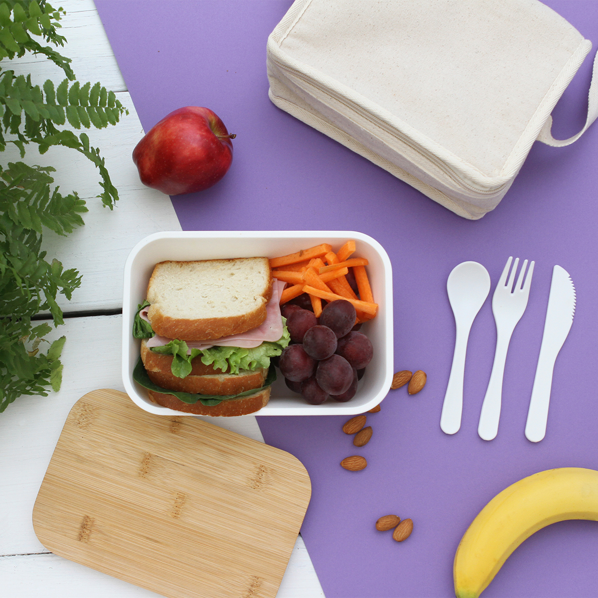Bolsa hielera de algodón con cierre y correa, incluye recipiente con acabados de bambú, resorte sujetador de cubiertos y cubiertos de plástico.