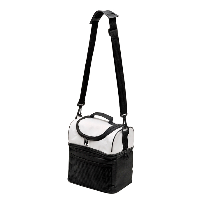 Hielera fabricada en nylon con 2 compartimentos para frío y calor, correa de hombro ajustable, bolsa tipo red al frente y asa