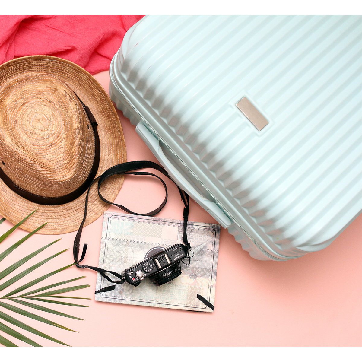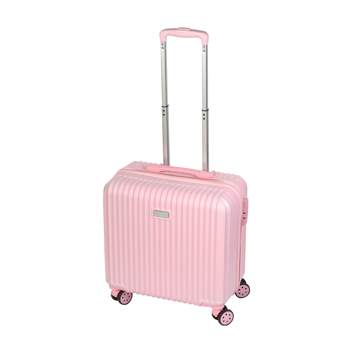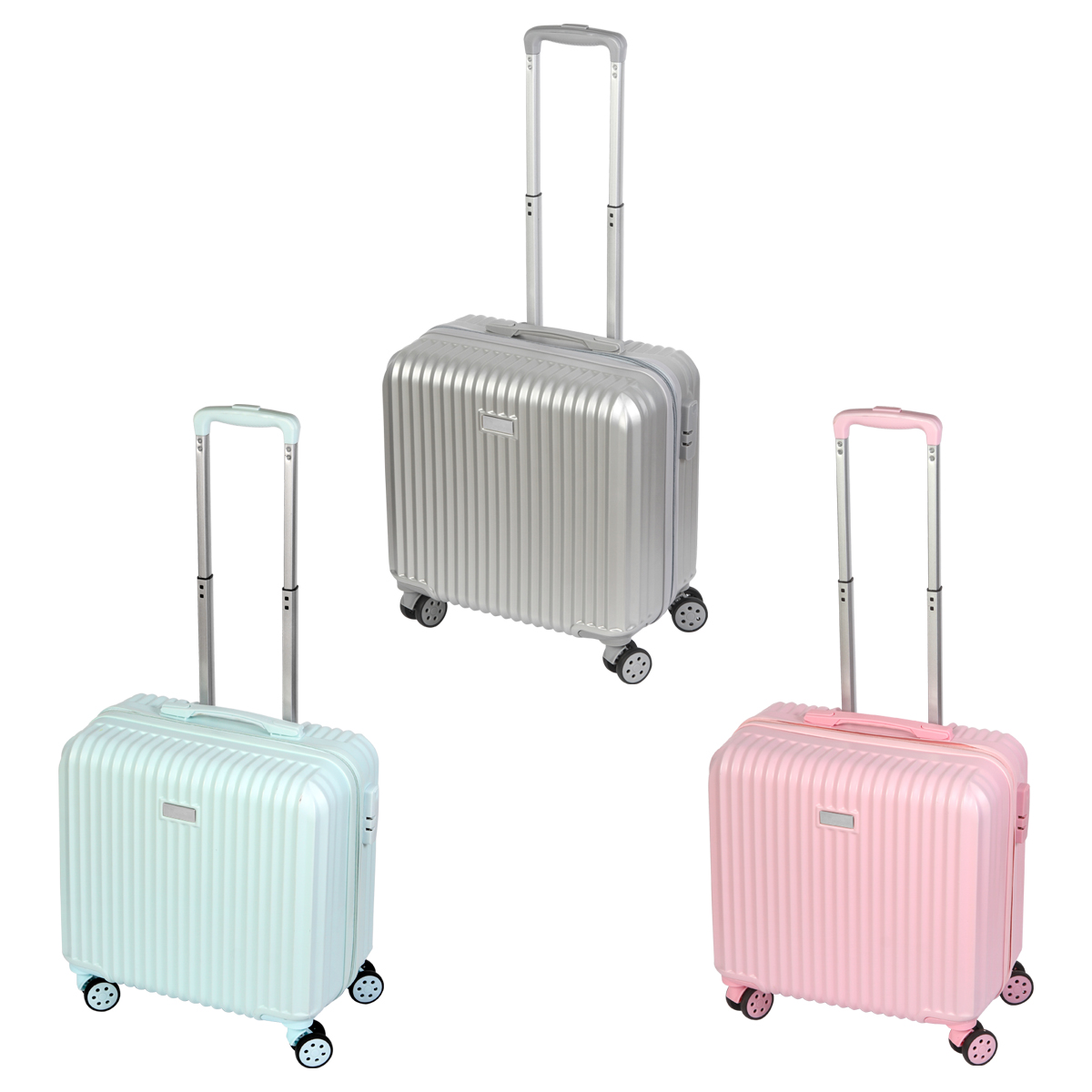 Maleta rígida tipo carry-on de 18", fabricada en plástico ABS y PC, con 4 ruedas giratorias, mango retráctil de aluminio, interiores en poliéster, chapa de seguridad, placa metálica y compartimento interior con cierre.