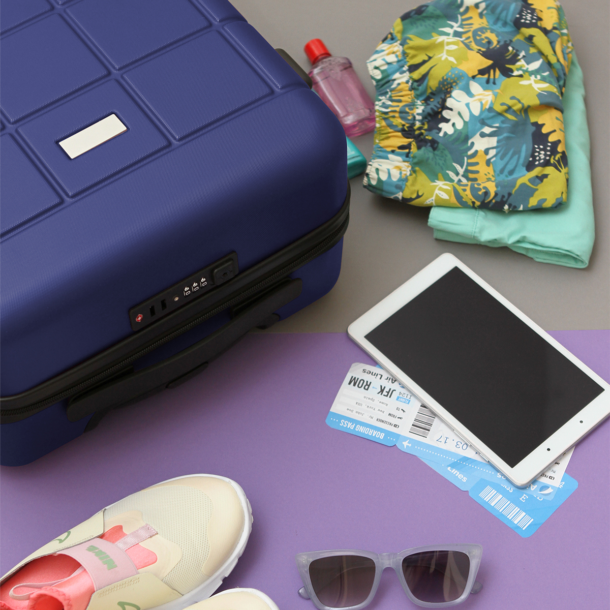 Maleta rígida fabricada en plástico ABS con 4 ruedas giratorias y agarradera desplegable.