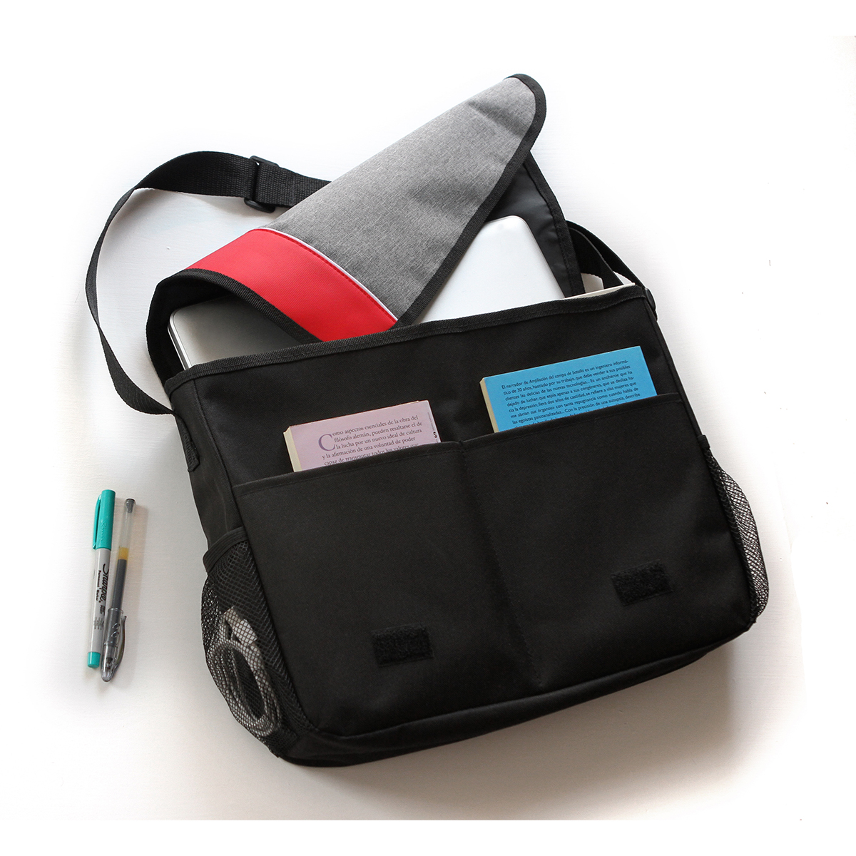 Maletín fabricado en poliéster con compartimento para laptop, bolsillo frontal con cierre y correa de hombro ajustable.