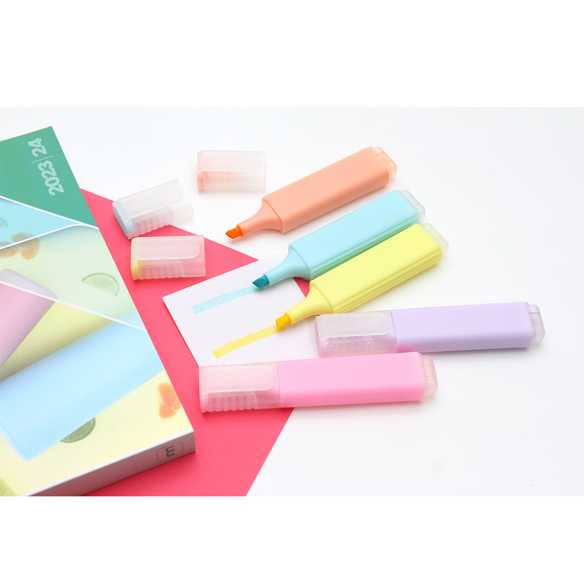 Marcador de texto, cuerpo y tapa fabricados de polipropileno en diferentes colores según el color de tinta fluorescente, colores disponibles naranja, azul, amarillo, morado y rosa. Te brinda opciones versátiles para resaltar y organizar la información, duración de la tinta de 10 a 12 meses aproximadamente.