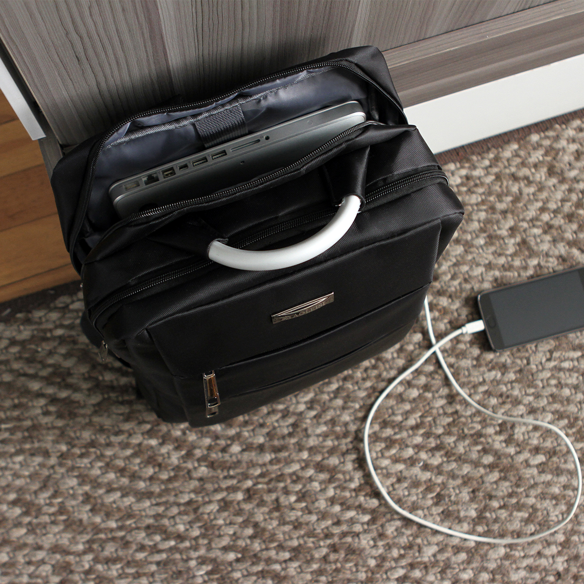 Mochila fabricada en poliéster con porta laptop, cable con puerto USB, múltiples compartimentos, cierres al frente, asa metálica y placa de metal al frente.