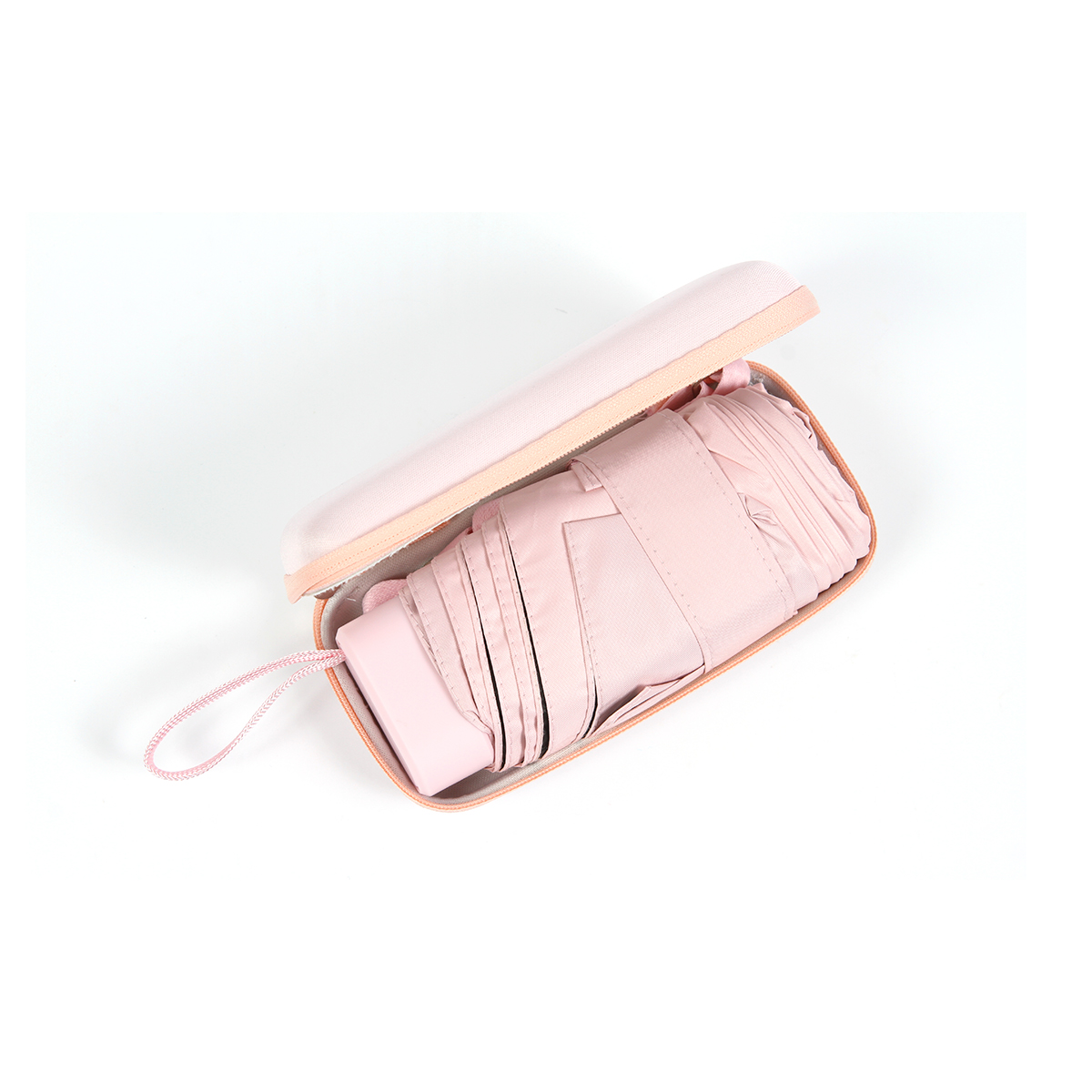 Paraguas de bolsillo, fabricado en 210T pongee, con poliuretano negro, montura y puño fabricados en ABS; con seis varillas. Incluye estuche fabricado en etilvinilacetato (EVA).