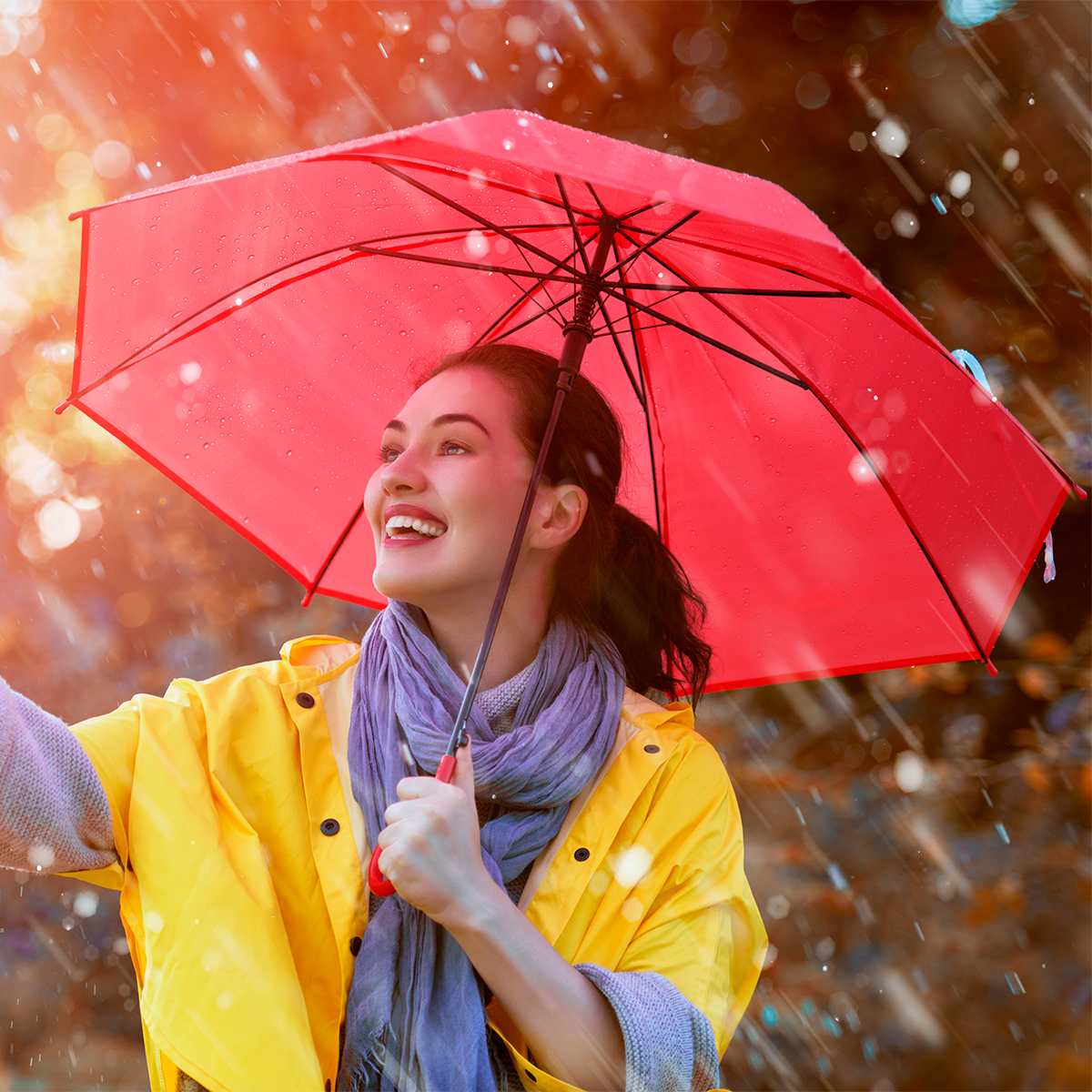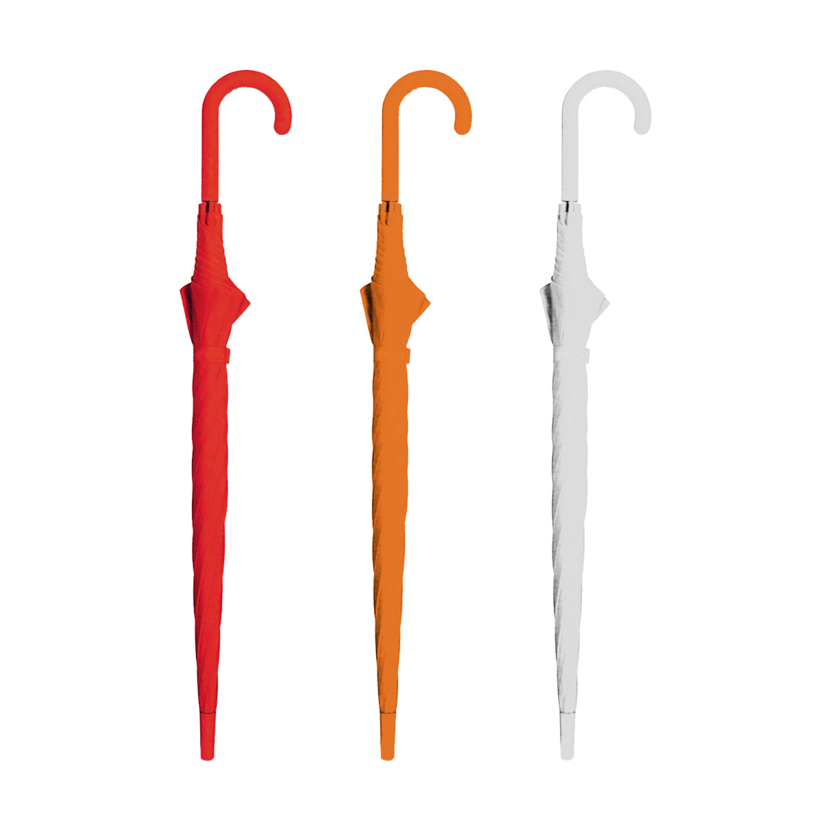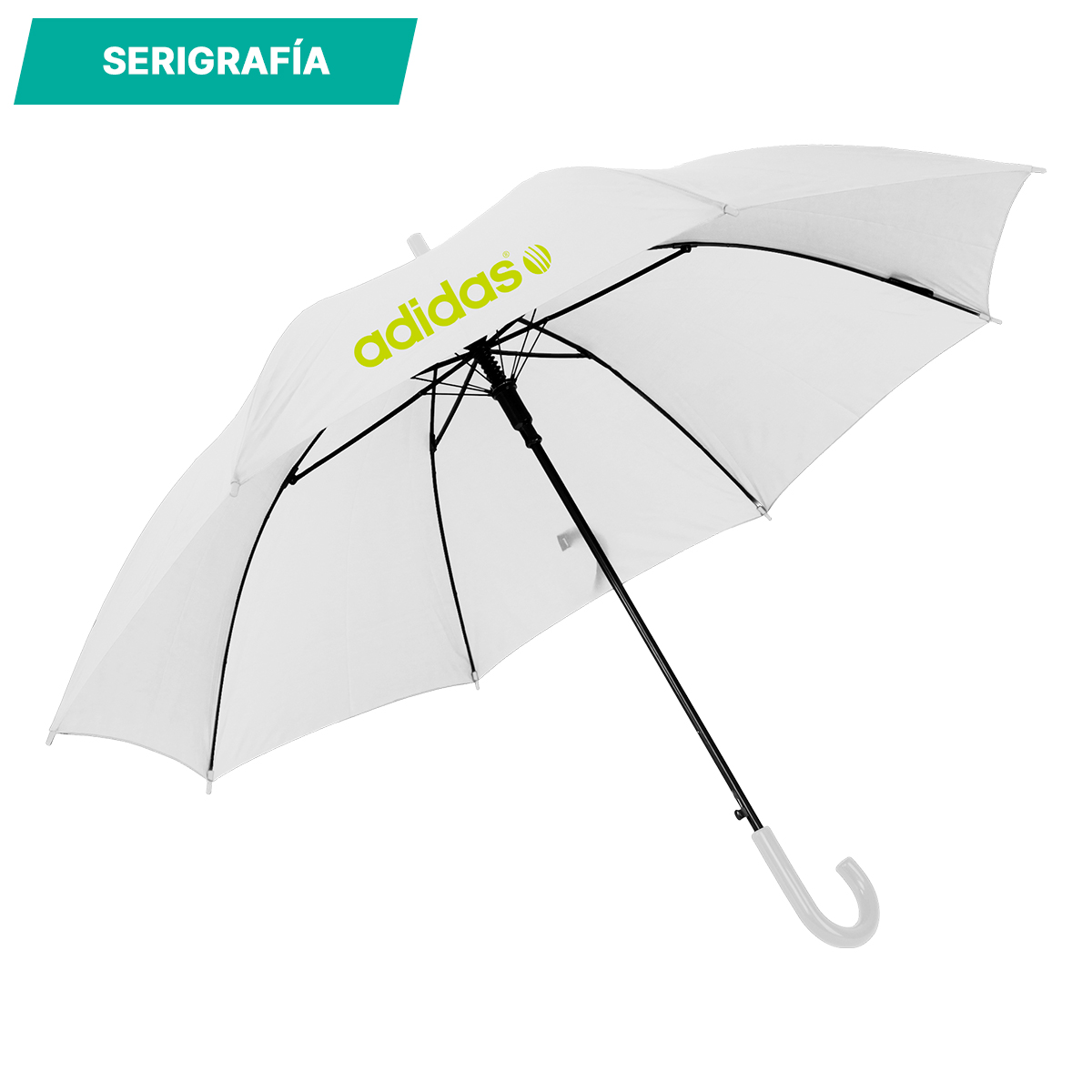 Paraguas fabricado en pongee de 23, 8 costillas, 8 gajos, auto open, marco de metal, costillas en fibra de vidrio y mango de plástico.
