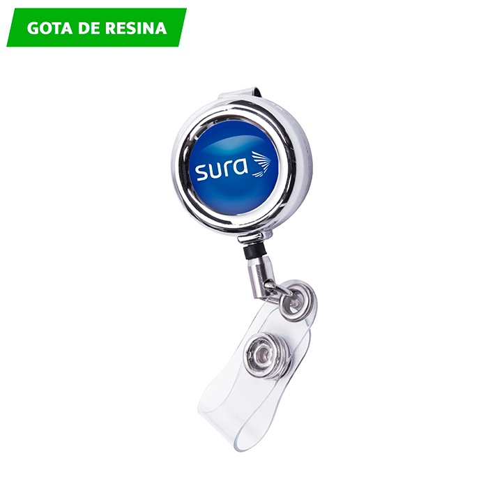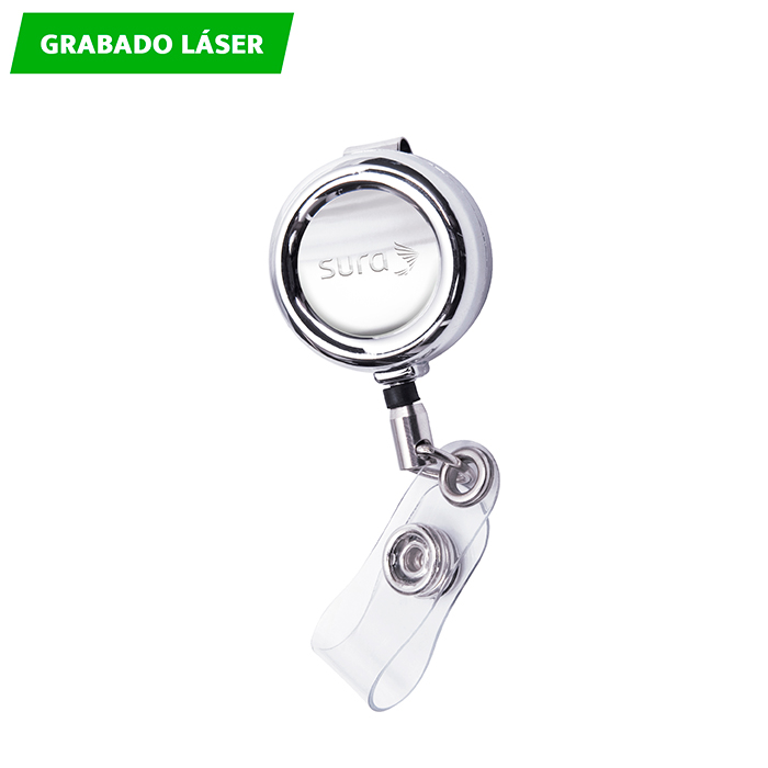 Porta gafete metálico retráctil. Incluye caja de cartón individual.