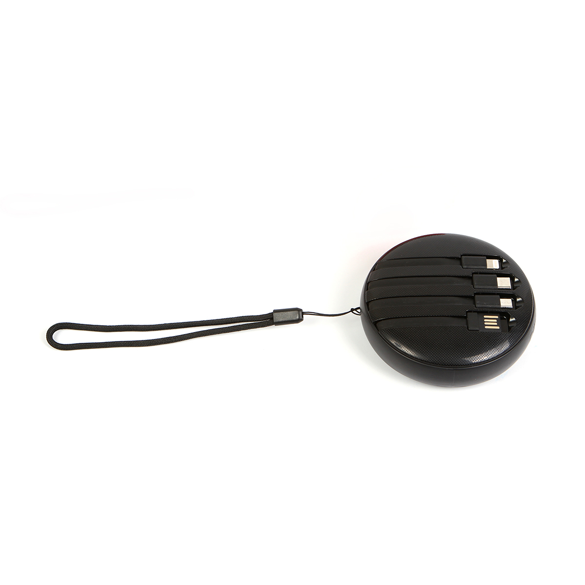Power bank con diseño circular y correa para fácil transporte. Capacidad de 10,000 mAh.