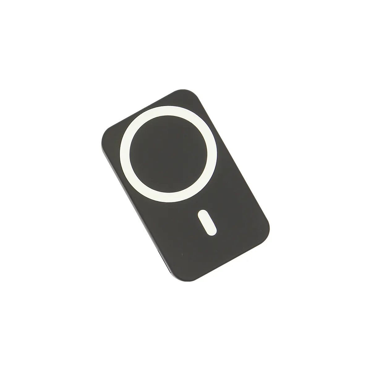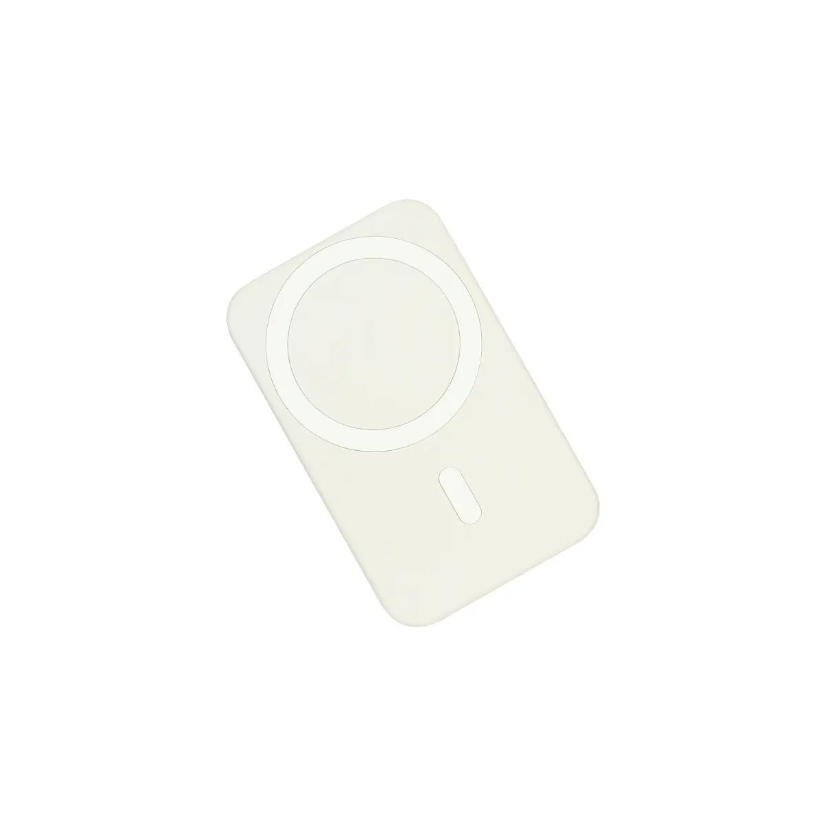 Power Bank inalámbrico compacto con capacidad de 5000 mAh, con entrada para carga tipo-C, salida inalámbrica con potencia de 15W y salida por cable con potencia de 20W. Fabricado en resistente plástico ABS y PC, ideal para una carga rápida y segura en cualquier lugar.
