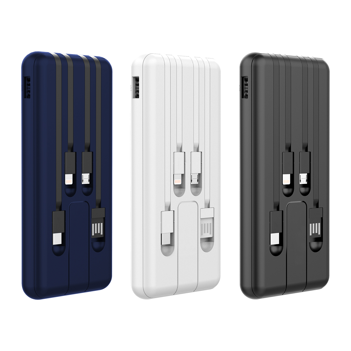 Power bank fabricada en plástico ABS con 1 salida USB y 4 cables de carga (tipo C, micro USB, iPhone, USB). Display con indicador del nivel de la batería. Batería de polímero de litio de 10,000 mAh. Incluye cable USB para carga y caja de cartón individual.