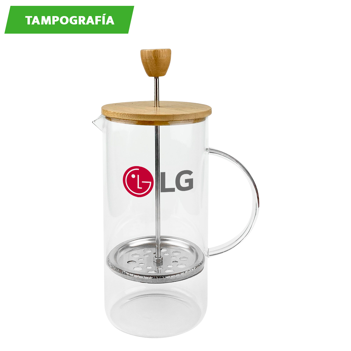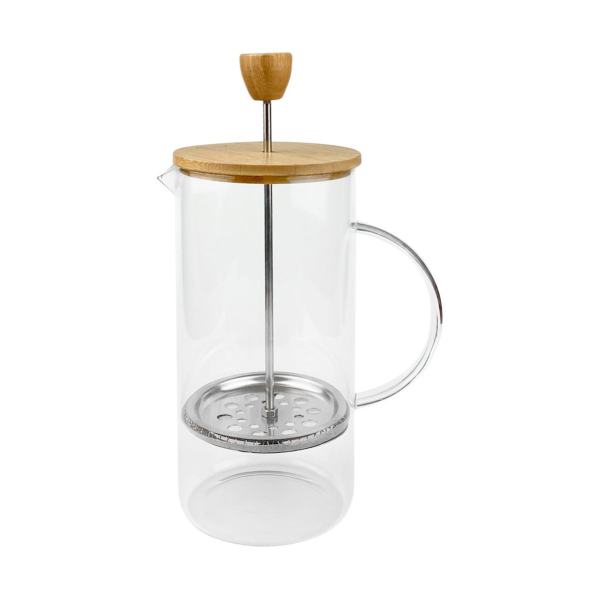 Prensa francesa fabricada en vidrio de borosilicato, con detalles en acero inoxidable y tapa de bambú. Capacidad 1000 ml. Incluye caja de cartón individual.