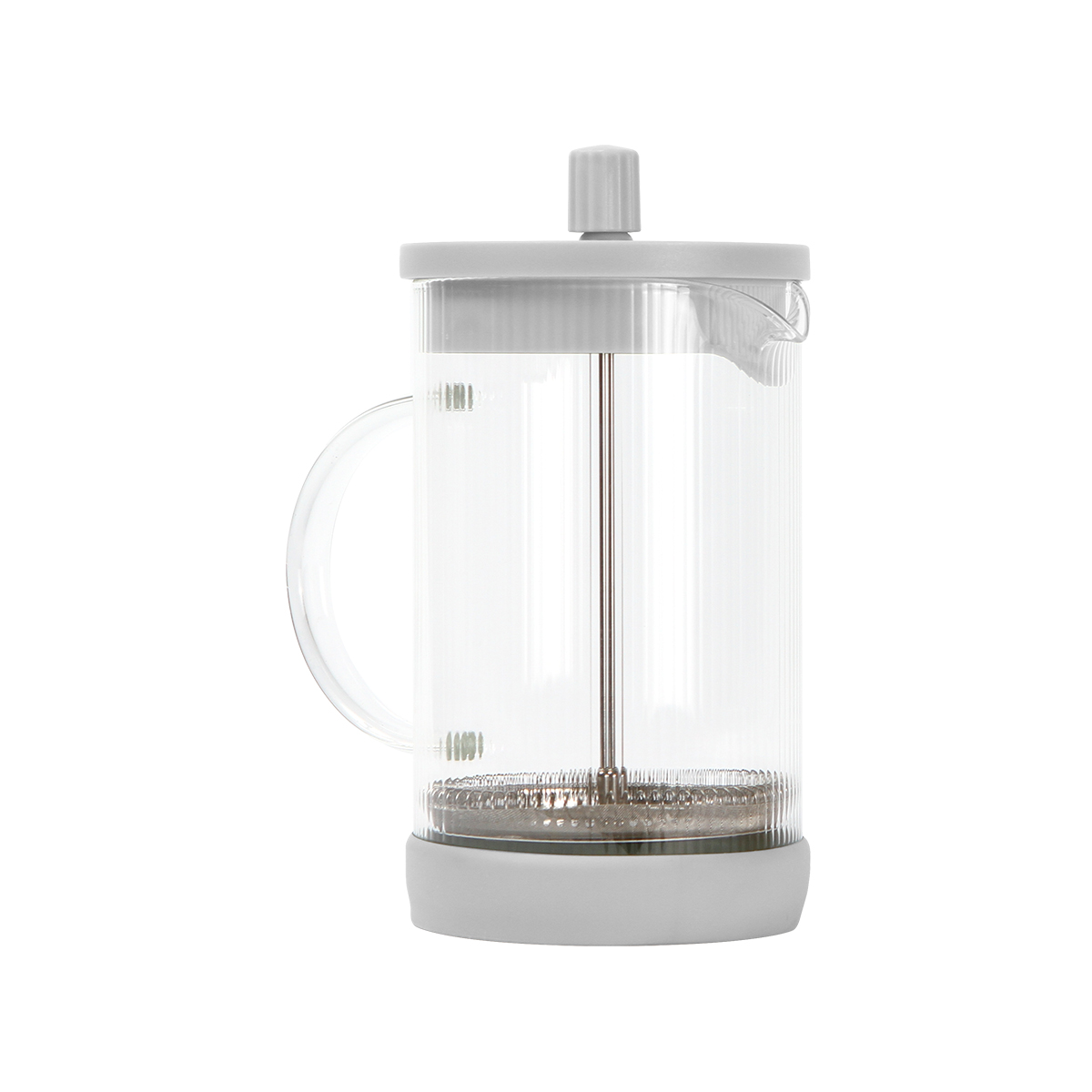 Prensa francesa de 800 ml, cuerpo fabricado en vidrio de borosilicato y acero inoxidable con tapa fabricada en polipropileno. La parte de abajo está fabricada en plástico tipo TPR característico por su flexibilidad, durabilidad, además, es removible para fácil limpieza.