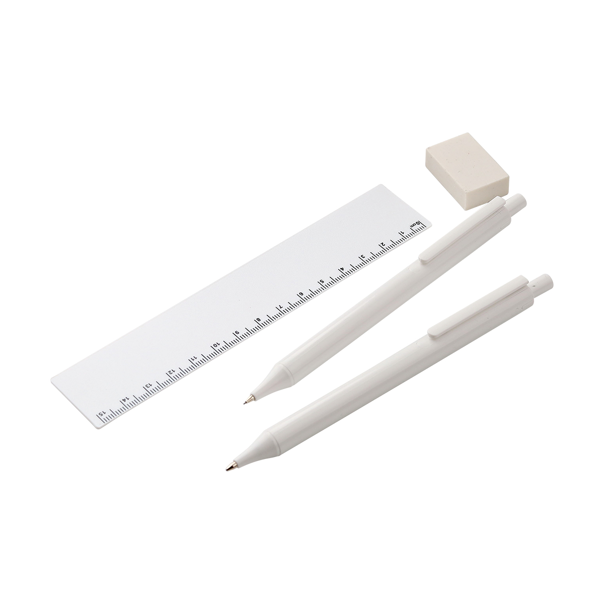 Set escolar fabricado en ABS con material Antibacterial (iones de plata). Incluye regla de 15cm, lapicero, bolígrafo con tinta negra, y goma; todo en un estuche fabricado en el mismo material Antibacterial con certificación ISO 22196 que inhibe hasta en un 99.9% el crecimiento y multiplicación de bacterias. El aditivo tiene como base los iones de plata, tecnología que que ha sido reconocida y utilizada durante siglos y que no tiene efectos dañinos.