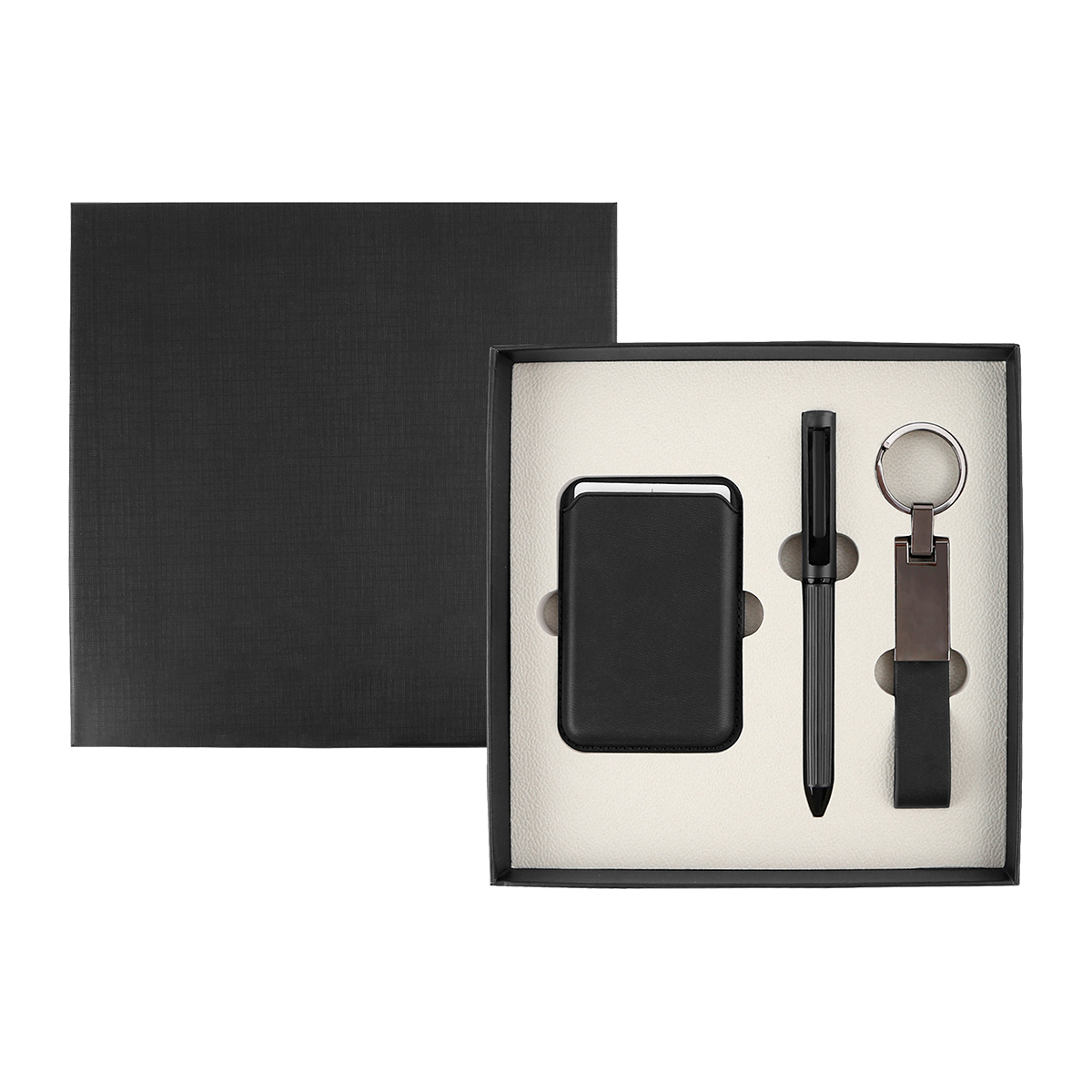 Set ejecutivo, incluye un bolígrafo tipo ball pen con barril fabricado en acero, tinta de escritura negra. Un soporte para teléfono fabricado en curpiel, su hoja de acero inoxidable con imán ayuda a que este se adhiera al teléfono celular para funcionar también como un tarjetero. Un llavero fabricado en acero inoxidable con detalles en curpiel. Incluye una caja de regalo.
