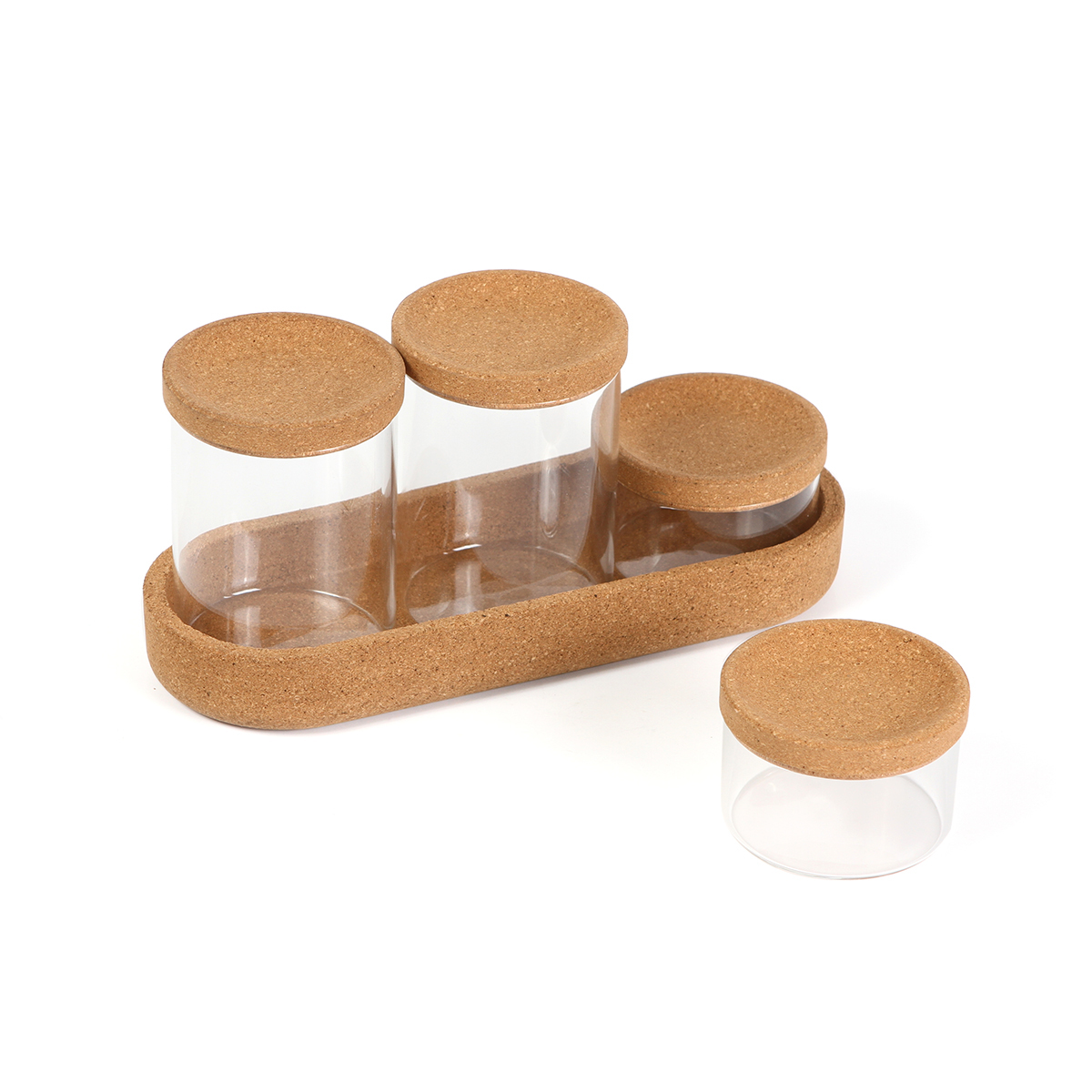 Set de contenedores para alimentos o artículos diversos fabricados en borosilicato (vidrio) y corcho. Incluye dos envases de 8x10 cm. y dos envases de 8x4 cm.