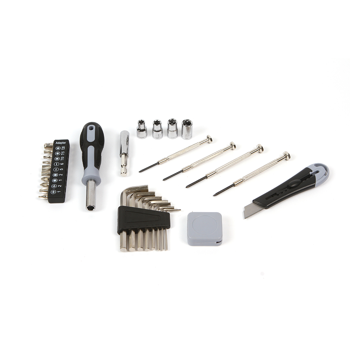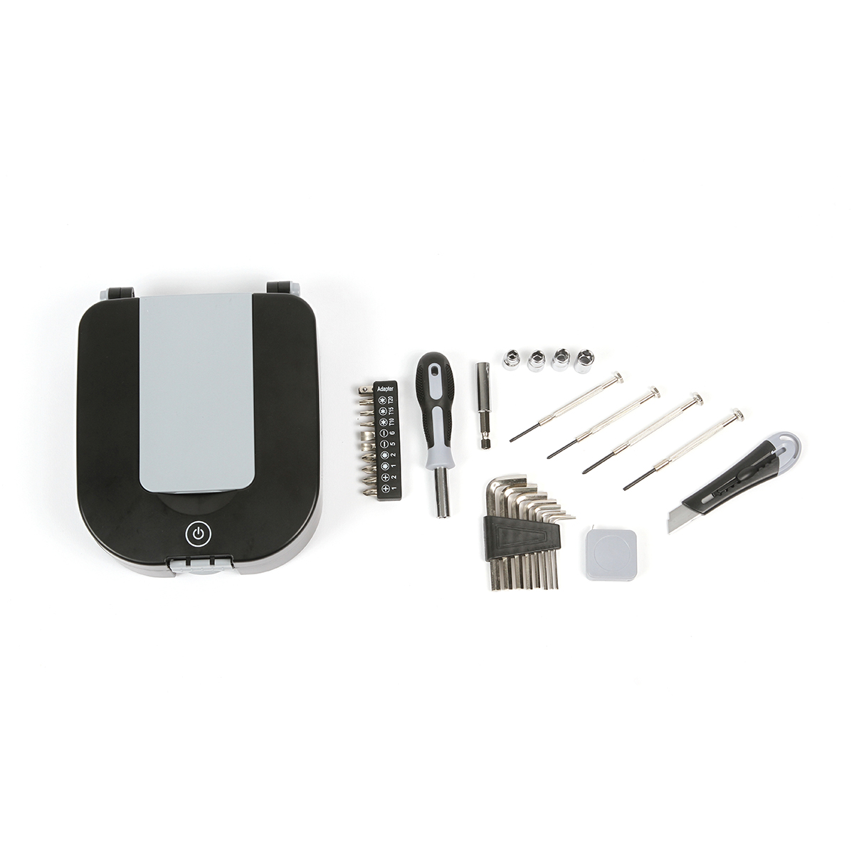 Set de herramientas con lámpara fabricado en plástico ABS, polipropileno con herramientas fabricadas en acero #45. Con medida de la caja de 19.3*15.5*6cm, este set contiene 30 piezas en total, distribuidas de la siguiente manera: 4 llaves de tubo. 1 cuchillo, 1 extensión, 1 mango destornillador, 4 piezas de destornillador a presión, 10 puntas de destornillador, 1 cinta métrica de 1 metro de longitud, 8 piezas de llave hexagonal. Una lámpara de luz LED, incluye luz blanca y luz cálida. Necesita pilas AA, no incluidas.