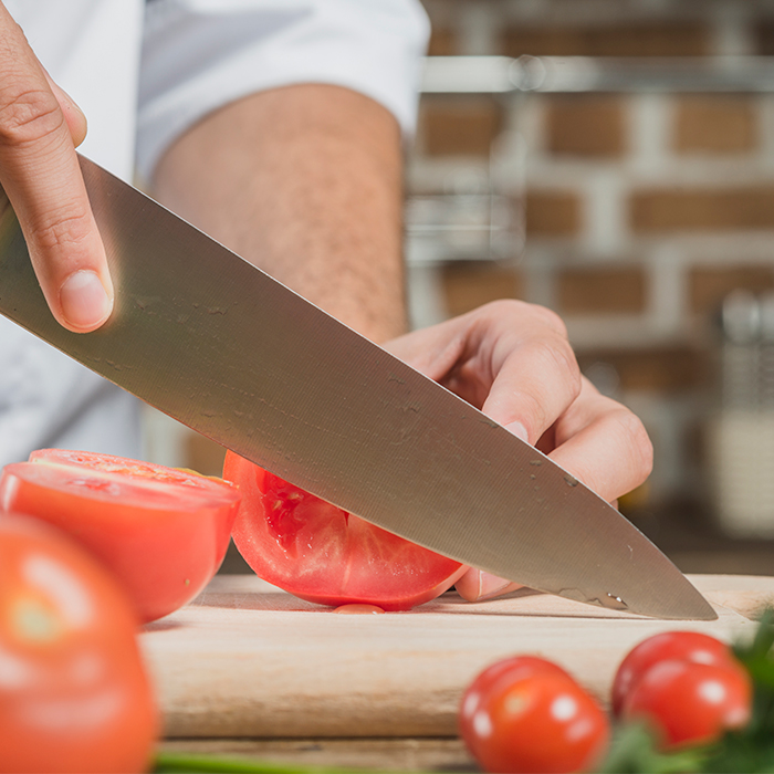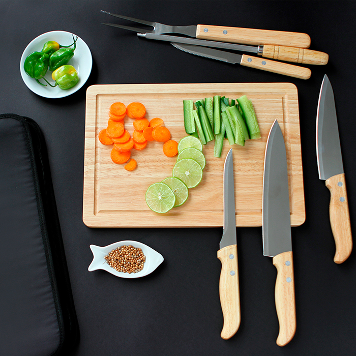 Set de BBQ fabricado en acero inoxidable y mangos de roble, incluye 7 piezas (cuchillo de chef, cuchillo pequeño, cuchillo deshuesador, cuchillo para carne, tenedor, afilador y tabla para cortar).